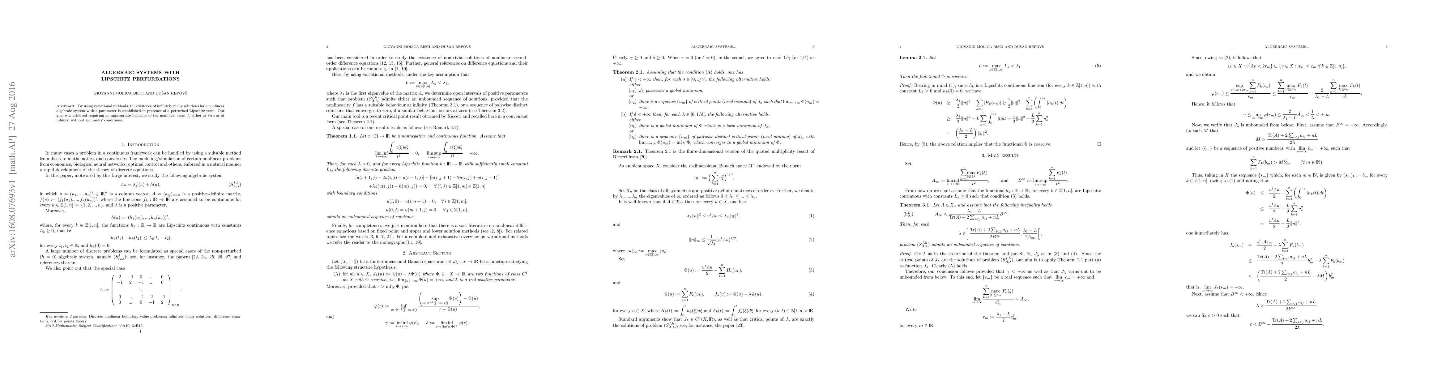 By using variational methods, the existence of infinitely many solutions for a nonlinear algebraic system with a parameter is established in presence of a perturbed Lipschitz term. Our goal was achieved requiring an appropriate behavior of the nonlinear term $f$, either at zero or at infinity, without symmetry conditions.