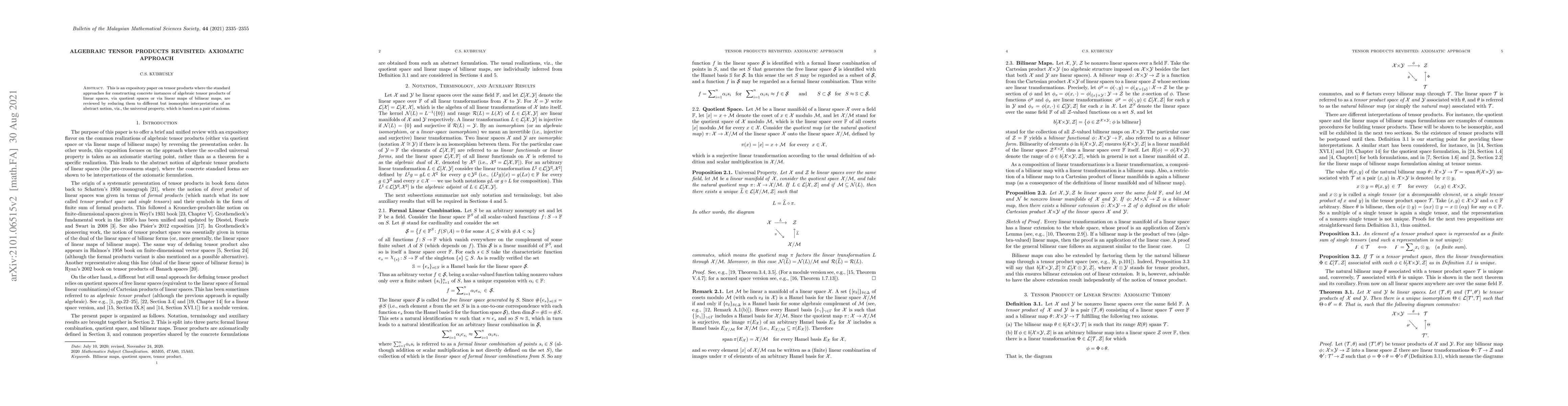 This paper reviews various constructions of algebraic tensor products, emphasizing their equivalence through a universal property defined by a pair of axioms. It highlights the isomorphic interpretations of these constructions via quotient spaces and bilinear maps.