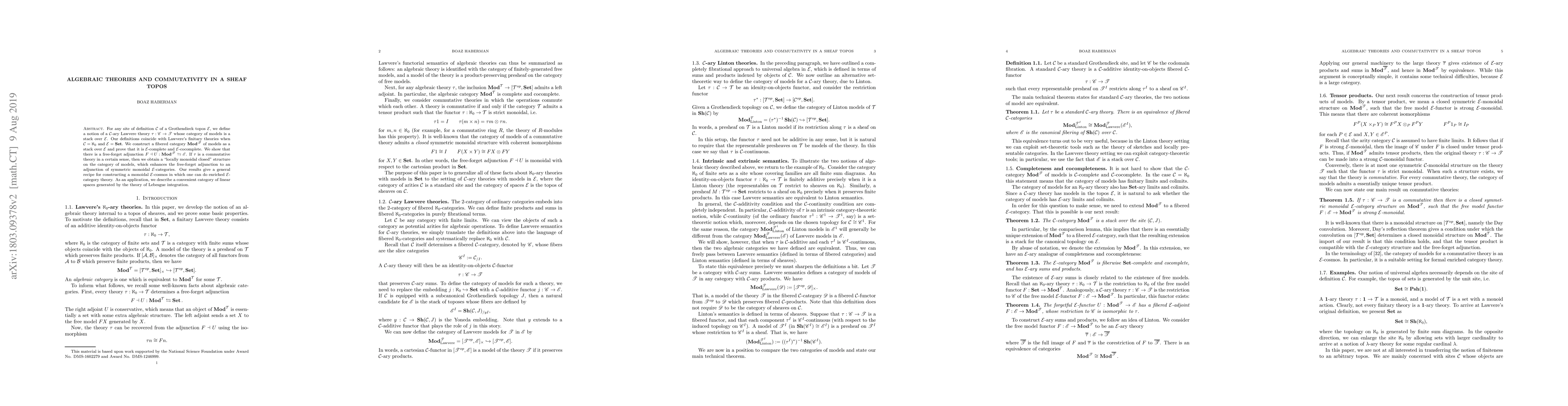 For any site of definition $\mathcal C$ of a Grothendieck topos $\mathcal E$, we define a notion of a $\mathcal C$-ary Lawvere theory $\tau: \mathscr C \to \mathscr T$ whose category of models is a stack over $\mathcal E$. Our definitions coincide with Lawvere's finitary theories when $\mathcal C=\aleph_0$ and $\mathcal E = \operatorname{\mathbf {Set}}$. We construct a fibered category $\operatorname{\mathbf {Mod}}^{\mathscr T}$ of models as a stack over $\mathcal E$ and prove that it is $\mathcal E$-complete and $\mathcal E$-cocomplete. We show that there is a free-forget adjunction $F \dashv U: \operatorname{\mathbf {Mod}}^{\mathscr T} \rightleftarrows \mathscr E$. If $\tau$ is a commutative theory in a certain sense, then we obtain a ``locally monoidal closed'' structure on the category of models, which enhances the free-forget adjunction to an adjunction of symmetric monoidal $\mathcal E$-categories. Our results give a general recipe for constructing a monoidal $\mathcal E$-cosmos in which one can do enriched $\mathcal E$-category theory. As an application, we describe a convenient category of linear spaces generated by the theory of Lebesgue integration.