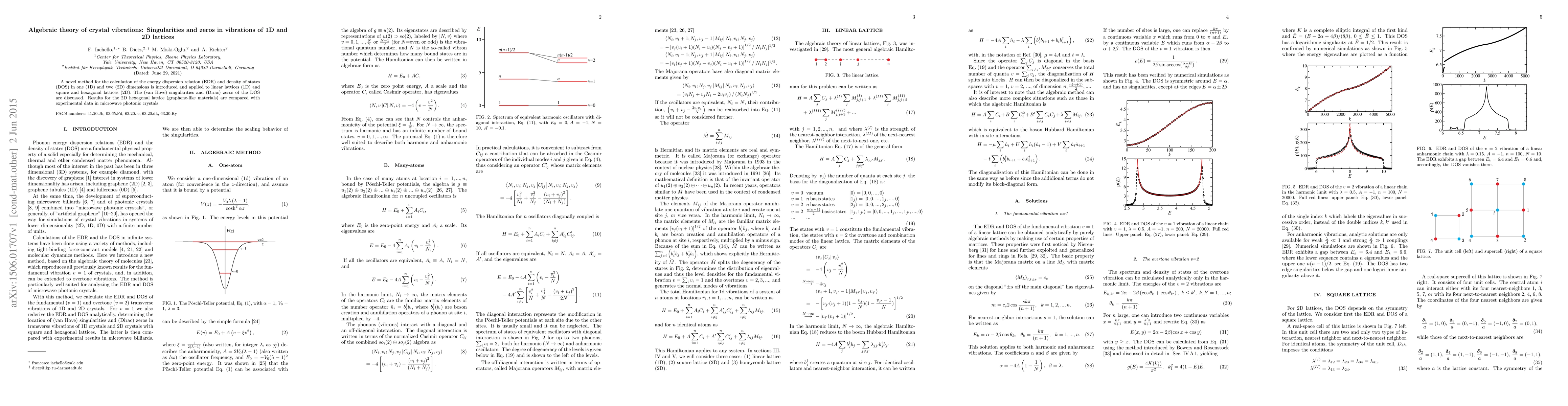 This paper introduces a new algebraic method to calculate energy dispersion relations and density of states for 1D and 2D lattices, focusing on singularities and zeros. It applies the method to linear, square, and hexagonal lattices, comparing results for graphene-like hexagonal lattices with experimental data from microwave photonic crystals.