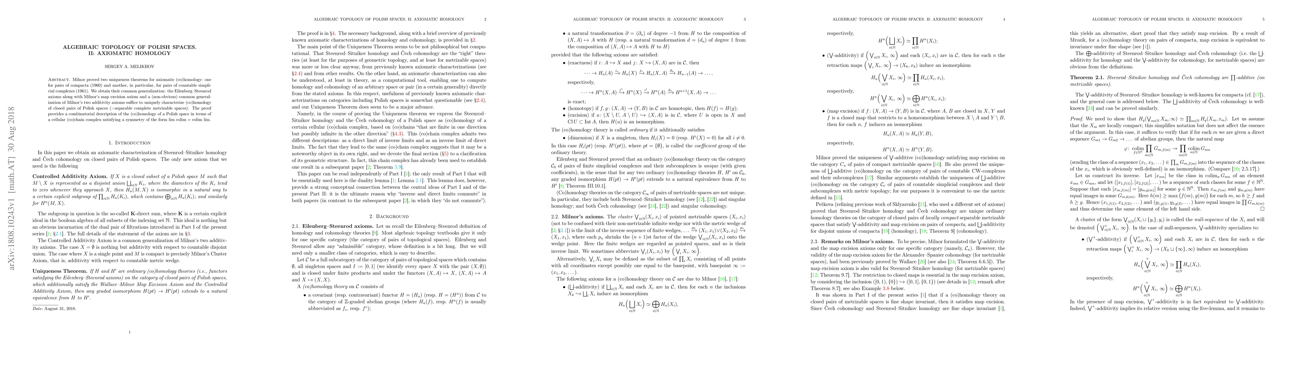 Milnor proved two uniqueness theorems for axiomatic (co)homology: one for pairs of compacta (1960) and another, in particular, for pairs of countable simplicial complexes (1961). We obtain their common generalization: the Eilenberg-Steenrod axioms along with Milnor's map excision axiom and a (non-obvious) common generalization of Milnor's two additivity axioms suffice to uniquely characterize (co)homology of closed pairs of Polish spaces (=separable complete metrizable spaces). The proof provides a combinatorial description of the (co)homology of a Polish space in terms of a cellular (co)chain complex satisfying a symmetry of the form $\lim \text{colim} = \text{colim} \lim$.