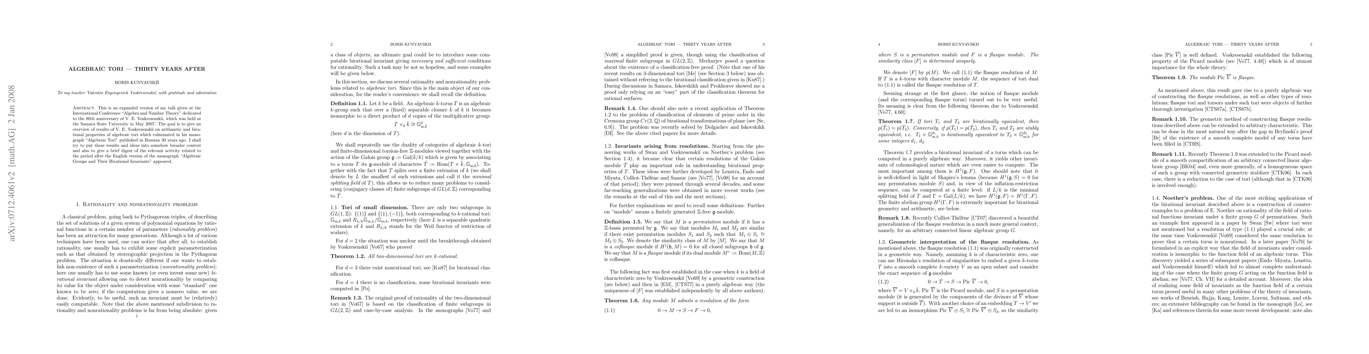 This paper provides an overview of V. E. Voskresenskii's significant contributions to the arithmetic and birational properties of algebraic tori, focusing on his influential monograph published 30 years ago. It contextualizes these results and discusses subsequent developments in the field following the publication of the English version of his related work.