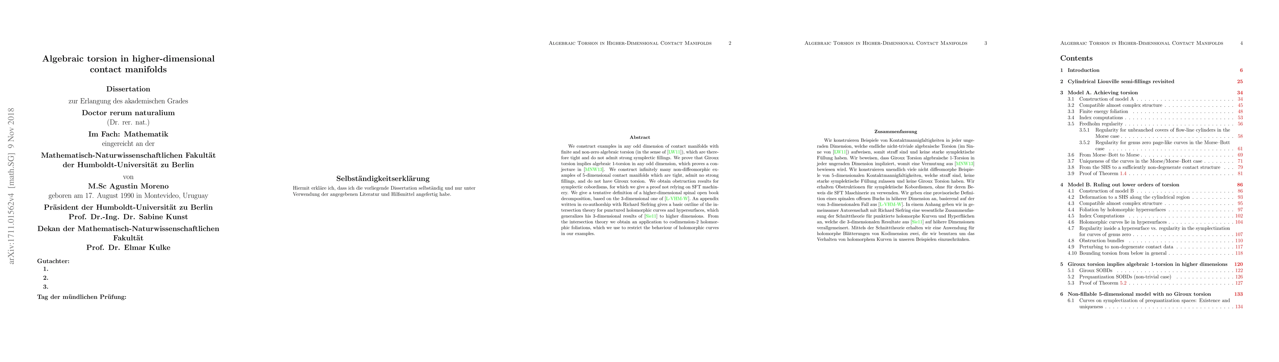 We construct examples in any odd dimension of contact manifolds with finite and non-zero algebraic torsion (in the sense of Latschev-Wendl), which are therefore tight and do not admit strong symplectic fillings. We prove that Giroux torsion implies algebraic $1$-torsion in any odd dimension, which proves a conjecture by Massot-Niederkrueger-Wendl. We construct infinitely many non-diffeomorphic examples of $5$-dimensional contact manifolds which are tight, admit no strong fillings, and do not have Giroux torsion. We obtain obstruction results for symplectic cobordisms, for which we give a proof not relying on SFT machinery. We give a tentative definition of a higher-dimensional spinal open book decomposition, based on the $3$-dimensional one of Lisi-van Horn Morris-Wendl. An appendix written in co-authorship with Richard Siefring gives a basic outline of the intersection theory for punctured holomorphic curves and hypersurfaces, which generalizes his $3$-dimensional results of Siefring to higher dimensions. From the intersection theory we obtain an application to codimension-$2$ holomorphic foliations, which we use to restrict the behaviour of holomorphic curves in our examples.