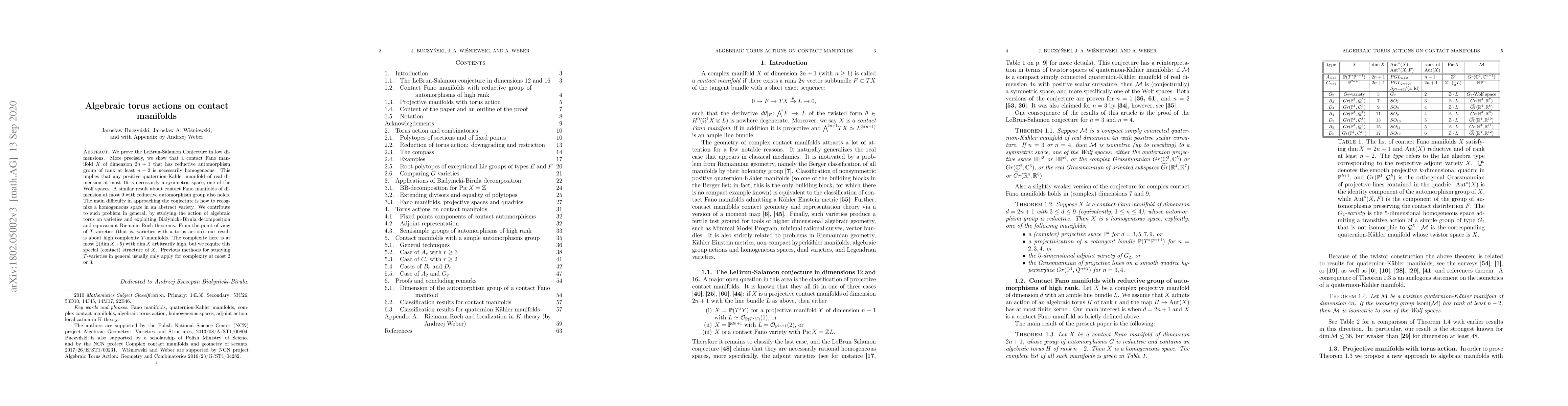 We prove the LeBrun-Salamon Conjecture in low dimensions. More precisely, we show that a contact Fano manifold X of dimension 2n+1 that has reductive automorphism group of rank at least n-2 is necessarily homogeneous. This implies that any positive quaternion-Kahler manifold of real dimension at most 16 is necessarily a symmetric space, one of the Wolf spaces. A similar result about contact Fano manifolds of dimension at most 9 with reductive automorphism group also holds. The main difficulty in approaching the conjecture is how to recognize a homogeneous space in an abstract variety. We contribute to such problem in general, by studying the action of algebraic torus on varieties and exploiting Bialynicki-Birula decomposition and equivariant Riemann-Roch theorems. From the point of view of T-varieties (that is, varieties with a torus action), our result is about high complexity T-manifolds. The complexity here is at most 1/2(dim X+5) with dim X arbitrarily high, but we require this special (contact) structure of X. Previous methods for studying T-varieties in general usually only apply for complexity at most 2 or 3.