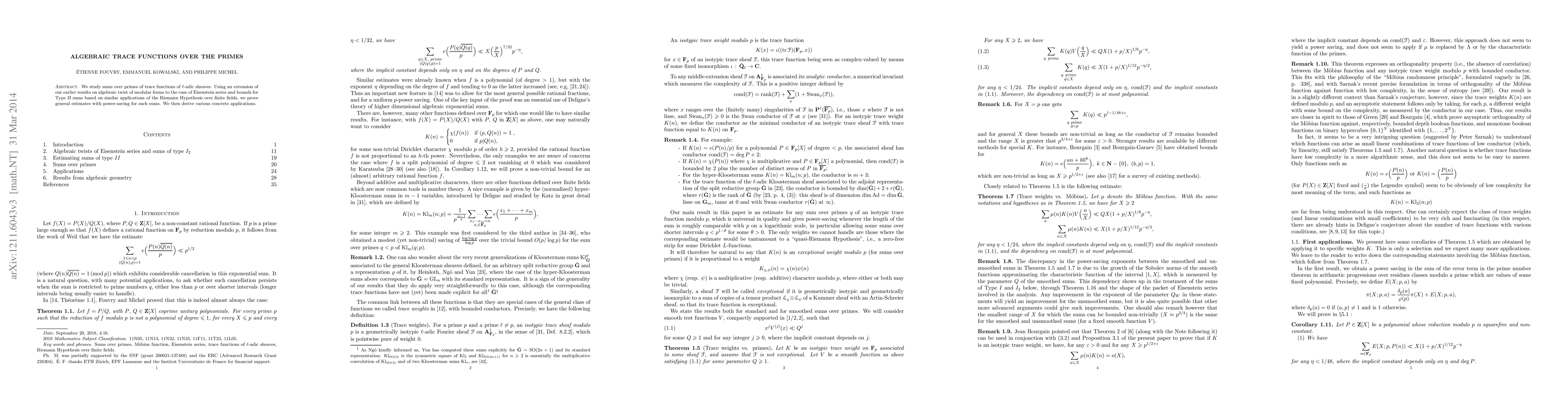 This paper studies sums over primes of trace functions of l-adic sheaves, proving general estimates with power-saving using the Riemann Hypothesis over finite fields and applying it to modular forms and Eisenstein series, with various concrete applications.