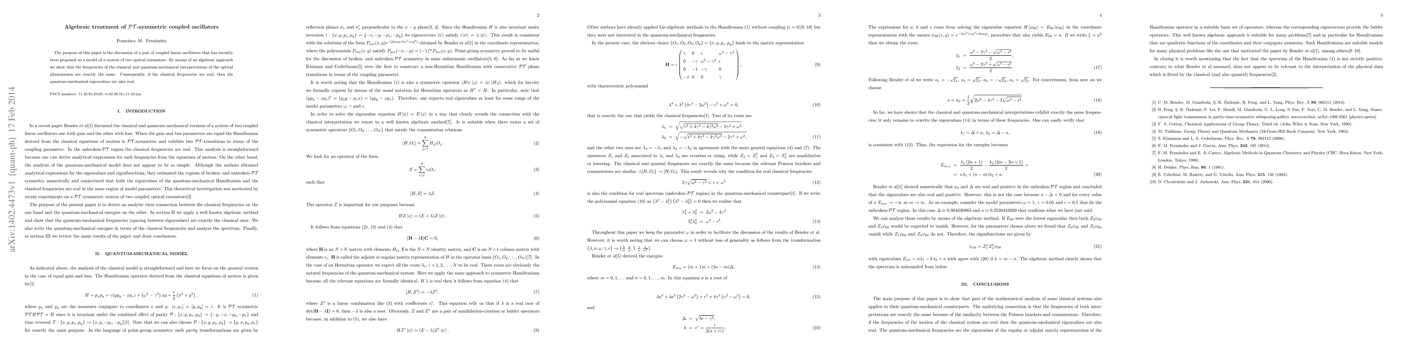 The purpose of this paper is the discussion of a pair of coupled linear oscillators that has recently been proposed as a model of a system of two optical resonators. By means of an algebraic approach we show that the frequencies of the classical and quantum-mechanical interpretations of the optical phenomenon are exactly the same. Consequently, if the classical frequencies are real, then the quantum-mechanical eigenvalues are also real.