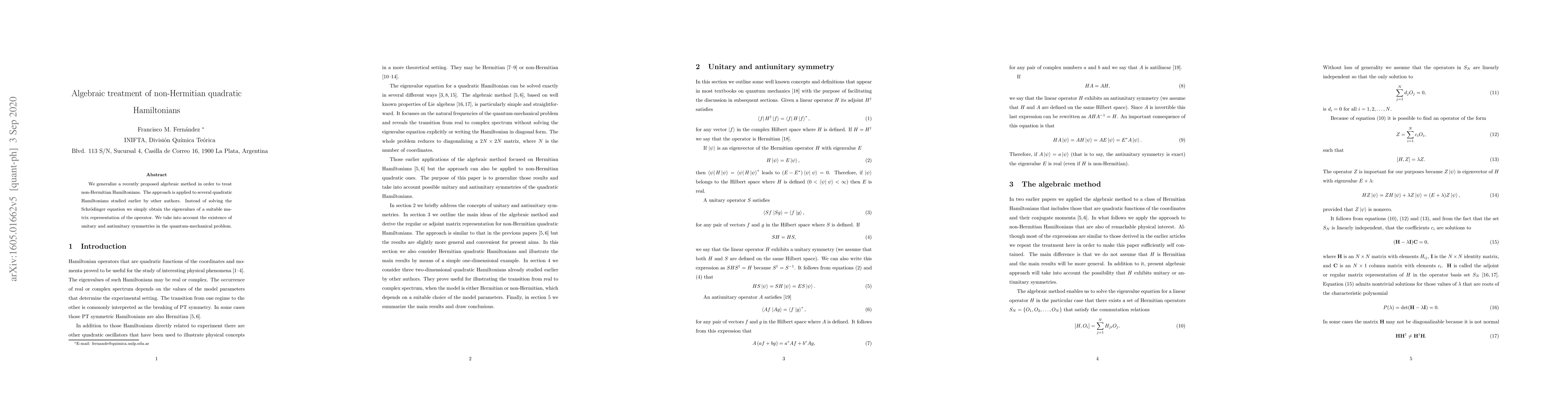 This paper generalizes an algebraic method to handle non-Hermitian quadratic Hamiltonians, deriving eigenvalues through matrix representation rather than solving the Schrödinger equation, while considering unitary and antiunitary symmetries. The method is tested on previously studied quadratic Hamiltonians.