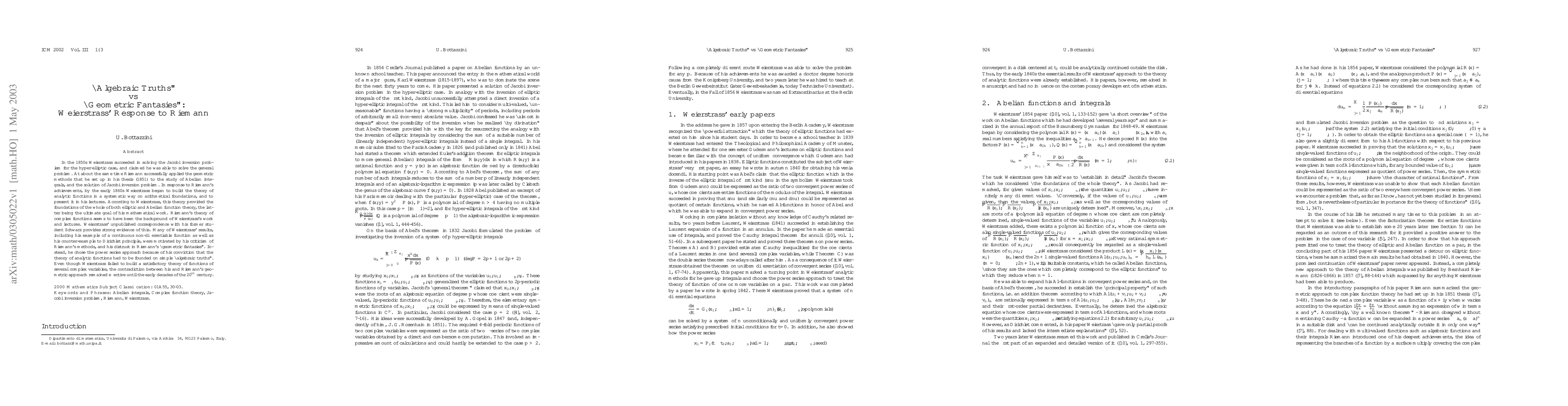 In the 1850s Weierstrass succeeded in solving the Jacobi inversion problem for the hyper-elliptic case, and claimed he was able to solve the general problem. At about the same time Riemann successfully applied the geometric methods that he set up in his thesis (1851) to the study of Abelian integrals, and the solution of Jacobi inversion problem. In response to Riemann's achievements, by the early 1860s Weierstrass began to build the theory of analytic functions in a systematic way on arithmetical foundations, and to present it in his lectures. According to Weierstrass, this theory provided the foundations of the whole of both elliptic and Abelian function theory, the latter being the ultimate goal of his mathematical work. Riemann's theory of complex functions seems to have been the background of Weierstrass's work and lectures. Weierstrass' unpublished correspondence with his former student Schwarz provides strong evidence of this. Many of Weierstrass' results, including his example of a continuous non-differentiable function as well as his counter-example to Dirichlet principle, were motivated by his criticism of Riemann's methods, and his distrust in Riemann's ``geometric fantasies''. Instead, he chose the power series approach because of his conviction that the theory of analytic functions had to be founded on simple "algebraic truths". Even though Weierstrass failed to build a satisfactory theory of functions of several complex variables, the contradiction between his and Riemann's geometric approach remained effective until the early decades of the 20$^{th}$ century.