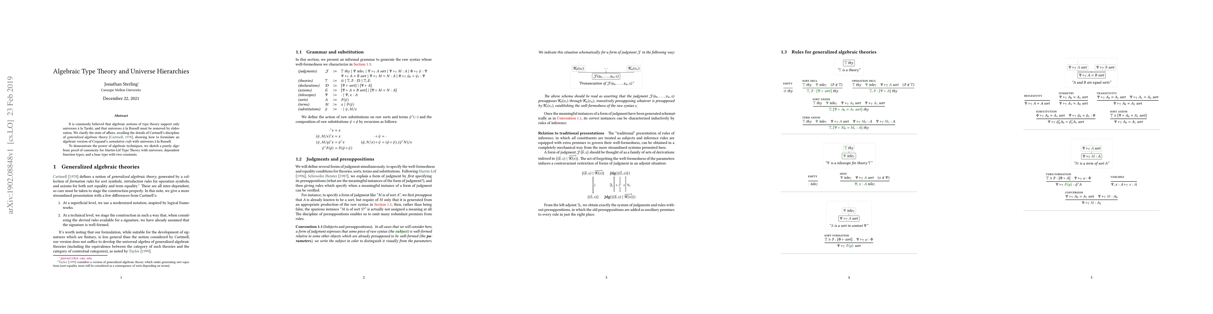 This paper clarifies the intersection of algebraic type theory and universe hierarchies, demonstrating a purely algebraic proof of canonicity for Martin-L"of Type Theory with universes, dependent function types, and a base type with two constants.