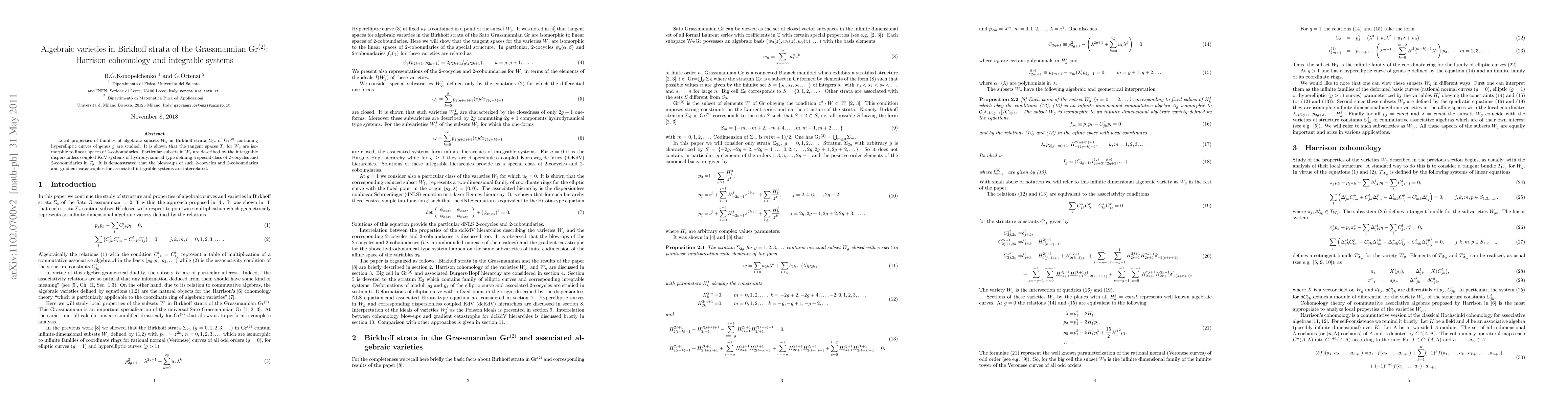 Local properties of families of algebraic subsets $W_g$ in Birkhoff strata $\Sigma_{2g}$ of Gr$^{(2)}$ containing hyperelliptic curves of genus $g$ are studied. It is shown that the tangent spaces $T_g$ for $W_g$ are isomorphic to linear spaces of 2-coboundaries. Particular subsets in $W_g$ are described by the intergrable dispersionless coupled KdV systems of hydrodynamical type defining a special class of 2-cocycles and 2-coboundaries in $T_g$. It is demonstrated that the blows-ups of such 2-cocycles and 2-coboundaries and gradient catastrophes for associated integrable systems are interrelated.