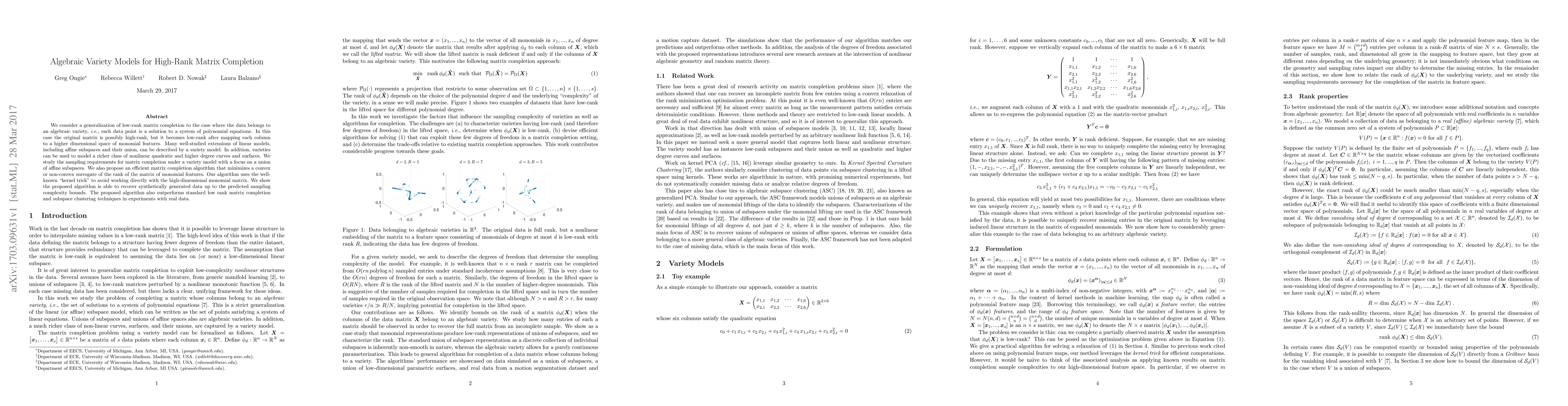We consider a generalization of low-rank matrix completion to the case where the data belongs to an algebraic variety, i.e. each data point is a solution to a system of polynomial equations. In this case the original matrix is possibly high-rank, but it becomes low-rank after mapping each column to a higher dimensional space of monomial features. Many well-studied extensions of linear models, including affine subspaces and their union, can be described by a variety model. In addition, varieties can be used to model a richer class of nonlinear quadratic and higher degree curves and surfaces. We study the sampling requirements for matrix completion under a variety model with a focus on a union of affine subspaces. We also propose an efficient matrix completion algorithm that minimizes a convex or non-convex surrogate of the rank of the matrix of monomial features. Our algorithm uses the well-known "kernel trick" to avoid working directly with the high-dimensional monomial matrix. We show the proposed algorithm is able to recover synthetically generated data up to the predicted sampling complexity bounds. The proposed algorithm also outperforms standard low rank matrix completion and subspace clustering techniques in experiments with real data.