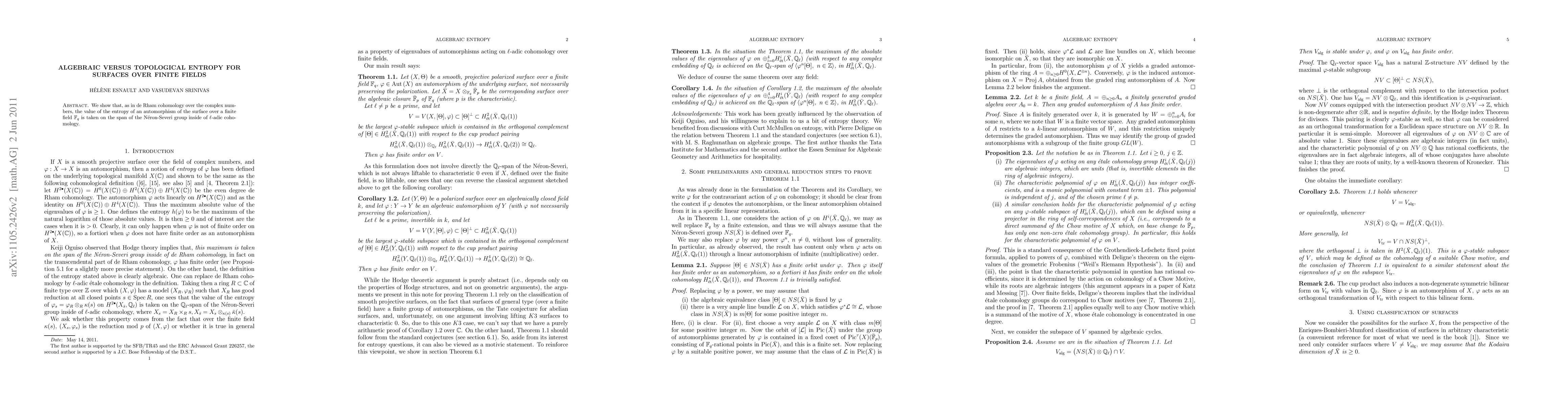 We show that, as in de Rham cohomology over the complex numbers, the value of the entropy of an automorphism of the surface over a finite field $\F_q $ is taken on the span of the N\'eron-Severi group inside of $\ell$-adic cohomology. v2: (some) typos removed, exposition (partly) improved.