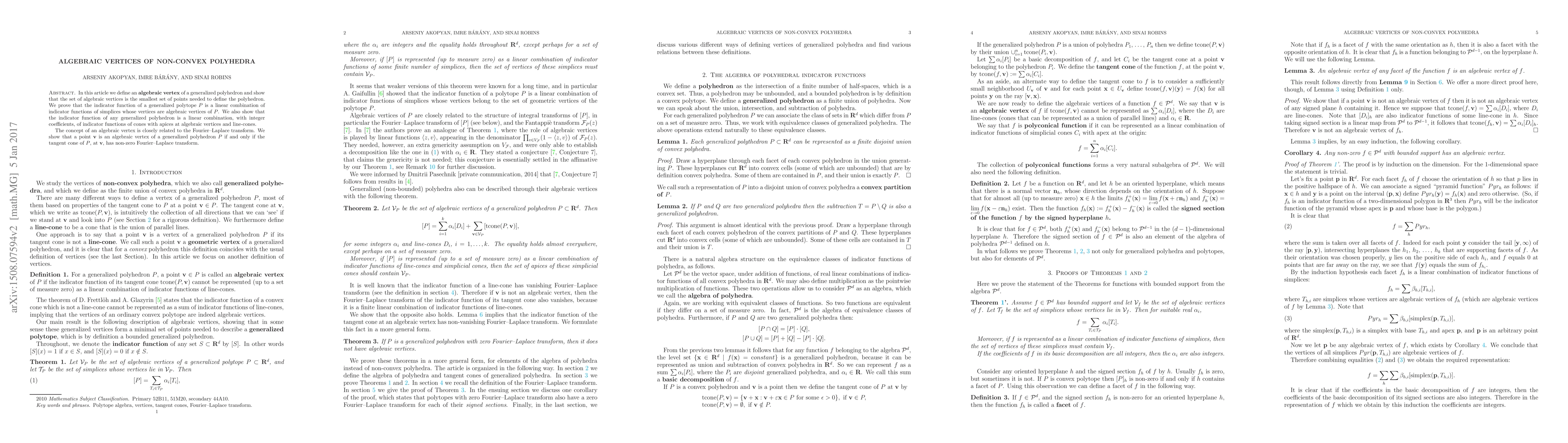 This paper introduces the concept of algebraic vertices for generalized polyhedra, proving they are the minimal set of points defining the polyhedron. It further demonstrates that the indicator function of a generalized polytope can be expressed as linear combinations involving simplices and cones anchored at these algebraic vertices, with implications for the Fourier-Laplace transform.