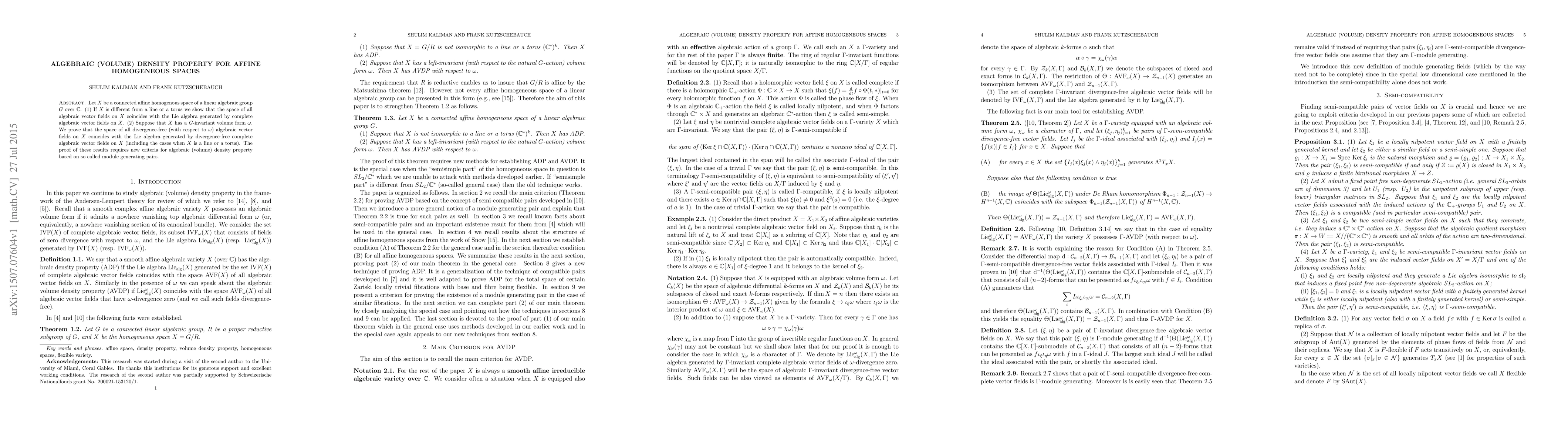This paper explores the algebraic density property for affine homogeneous spaces, proving that the space of all algebraic vector fields on such spaces coincides with the Lie algebra generated by complete algebraic vector fields, except for lines and tori. It also establishes the volume density property for divergence-free algebraic vector fields when a $G$-invariant volume form exists, using new criteria based on module generating pairs.