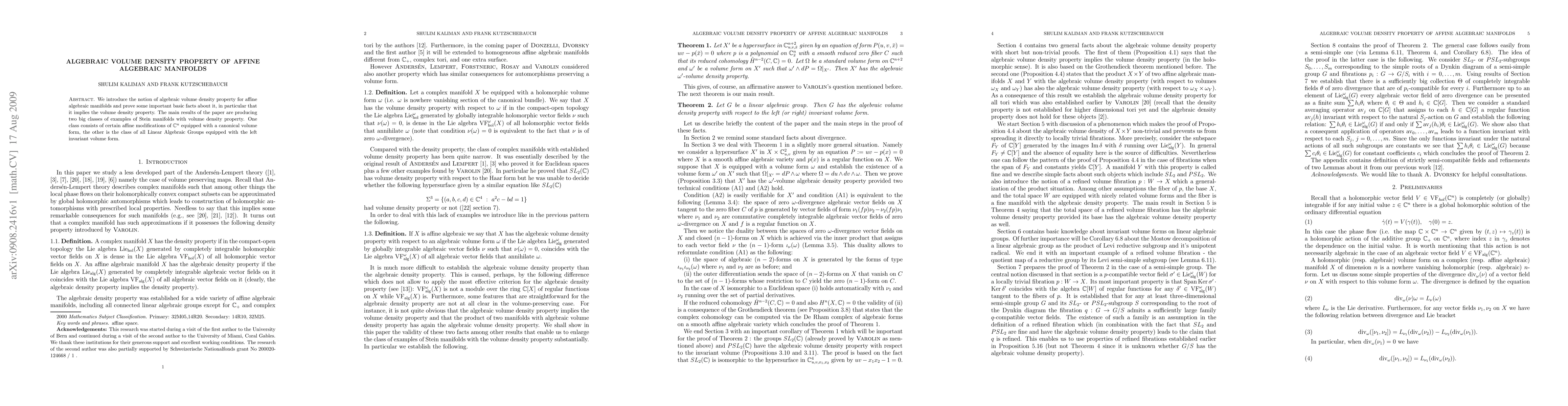 This paper introduces the algebraic volume density property for affine algebraic manifolds and proves that it implies the volume density property. The authors provide two significant classes of Stein manifolds with this property: affine modifications of $\C^n$ and all linear algebraic groups with left-invariant volume forms.