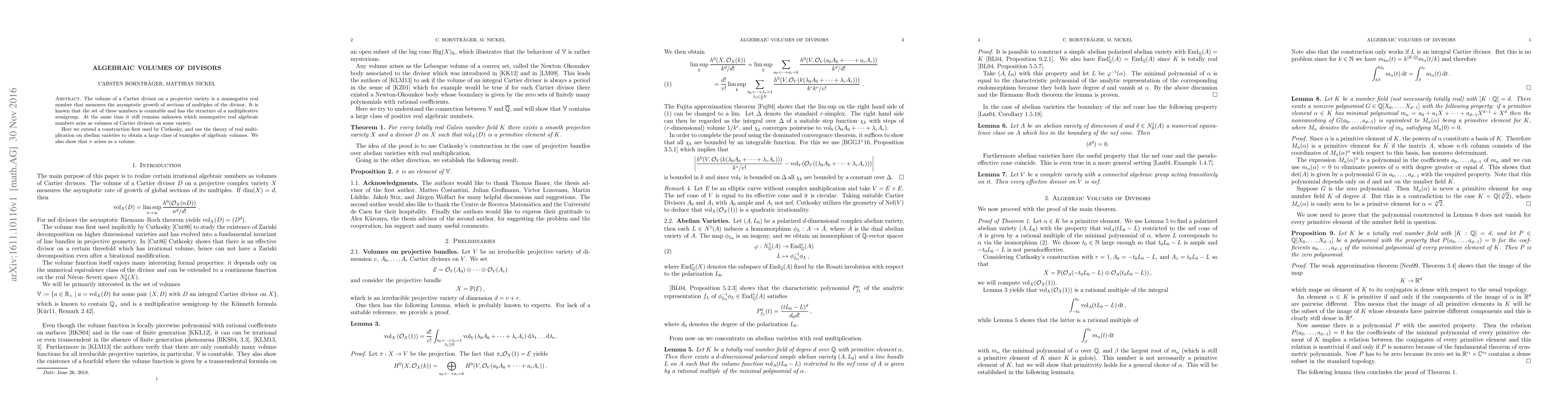 The volume of a Cartier divisor on a projective variety is a nonnegative real number that measures the asymptotic growth of sections of multiples of the divisor. It is known that the set of these numbers is countable and has the structure of a multiplicative semigroup. At the same time it still remains unknown which nonnegative real algebraic numbers arise as volumes of Cartier divisors on some variety. Here we extend a construction first used by Cutkosky, and use the theory of real multiplication on abelian varieties to obtain a large class of examples of algebraic volumes. We also show that $\pi$ arises as a volume.