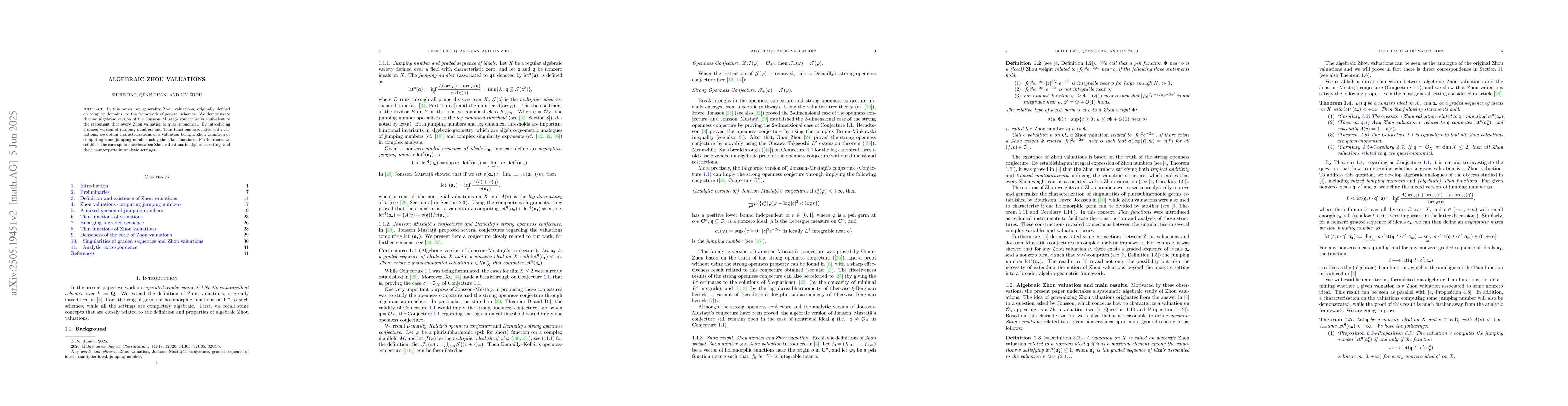 Researchers generalize Zhou valuations to algebraic schemes, establishing a connection between these valuations and analytic counterparts, with implications for understanding quasi-monomial valuations.