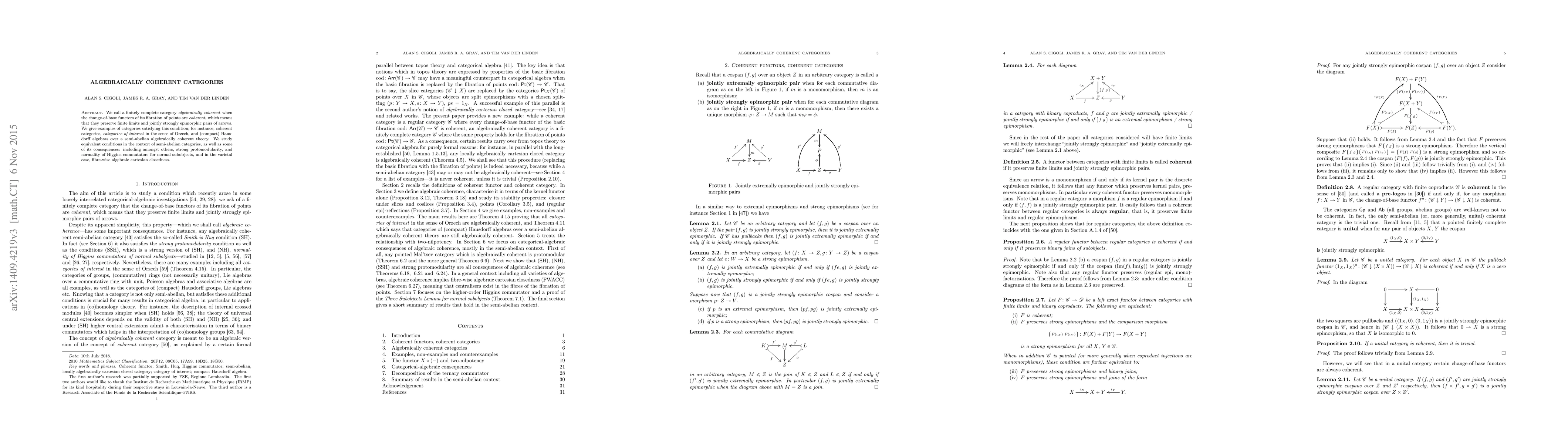 This paper defines algebraically coherent categories as finitely complete categories where change-of-base functors preserve finite limits and jointly strong epimorphic pairs. It explores examples like coherent categories and Hausdorff algebras, and discusses equivalent conditions and consequences in semi-abelian categories, including strong protomodularity and normality of Higgins commutators.