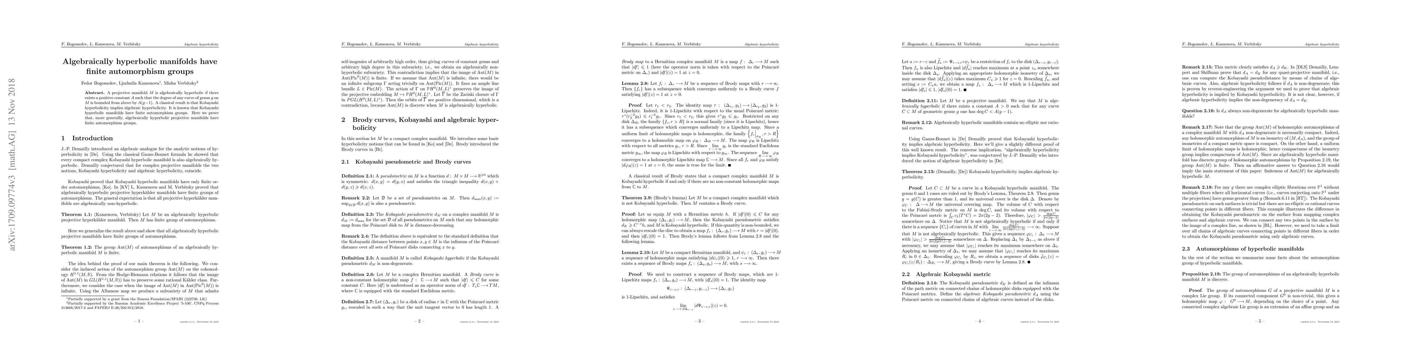 The paper proves that algebraically hyperbolic projective manifolds, where the degree of any curve is bounded by a constant times its genus minus one, have finite automorphism groups. This extends the result from Kobayashi hyperbolic manifolds to the broader class of algebraically hyperbolic manifolds.
