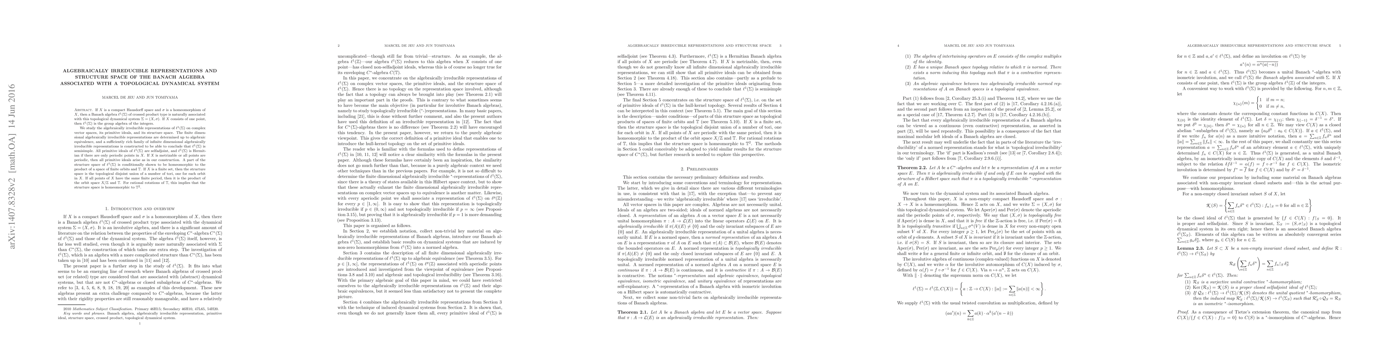 This paper investigates the algebraically irreducible representations, primitive ideals, and structure space of the Banach algebra $\ell^1(\Sigma)$ associated with the topological dynamical system $\Sigma=(X,\sigma)$. The authors show that $\ell^1(\Sigma)$ is semisimple and explore its structure space, revealing it to be homeomorphic to the product of a space of finite orbits and $\mathbb T$ under certain conditions.