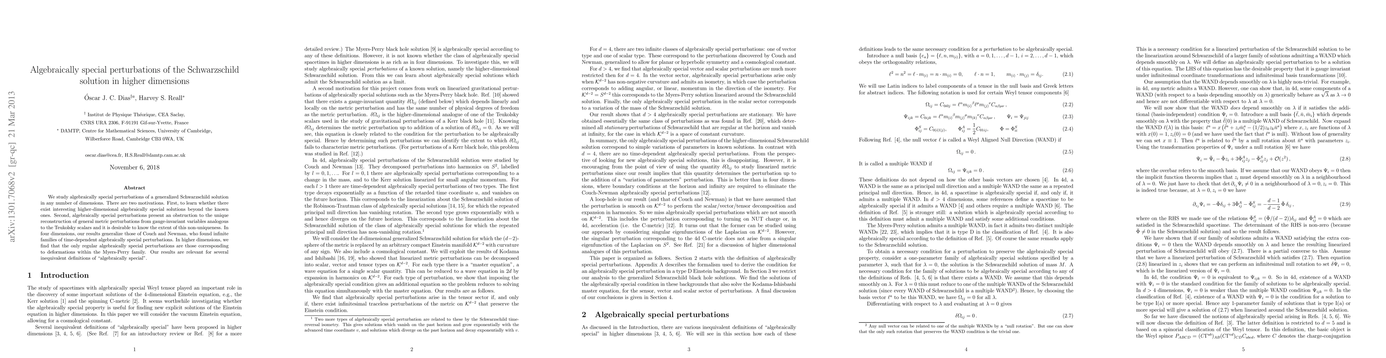 We study algebraically special perturbations of a generalized Schwarzschild solution in any number of dimensions. There are two motivations. First, to learn whether there exist interesting higher-dimensional algebraically special solutions beyond the known ones. Second, algebraically special perturbations present an obstruction to the unique reconstruction of general metric perturbations from gauge-invariant variables analogous to the Teukolsky scalars and it is desirable to know the extent of this non-uniqueness. In four dimensions, our results generalize those of Couch and Newman, who found infinite families of time-dependent algebraically special perturbations. In higher dimensions, we find that the only regular algebraically special perturbations are those corresponding to deformations within the Myers-Perry family. Our results are relevant for several inequivalent definitions of "algebraically special".