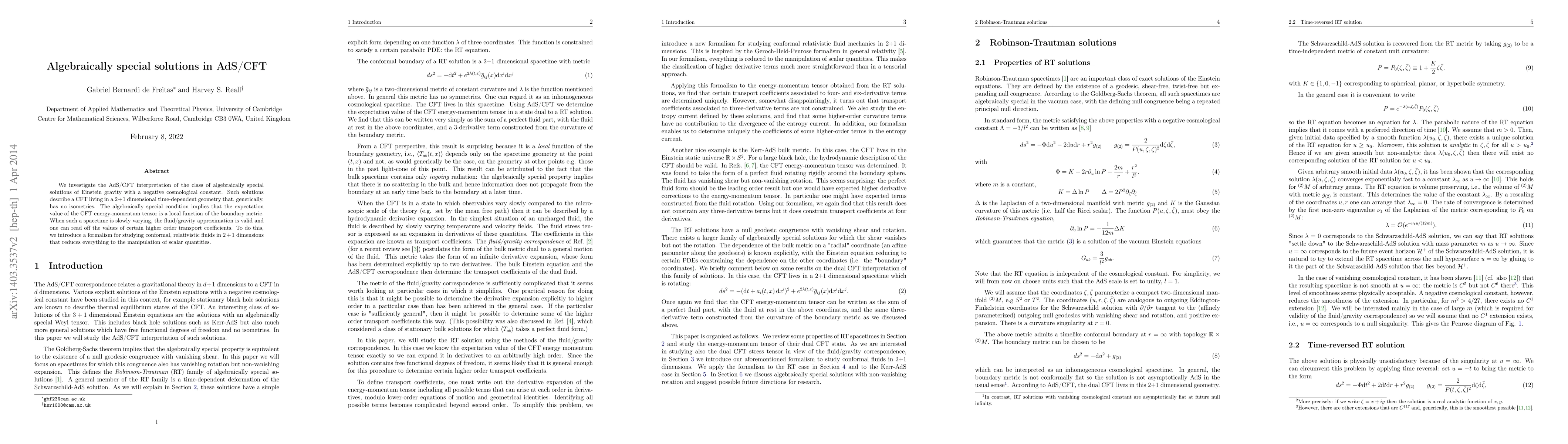 We investigate the AdS/CFT interpretation of the class of algebraically special solutions of Einstein gravity with a negative cosmological constant. Such solutions describe a CFT living in a 2+1 dimensional time-dependent geometry that, generically, has no isometries. The algebraically special condition implies that the expectation value of the CFT energy-momentum tensor is a local function of the boundary metric. When such a spacetime is slowly varying, the fluid/gravity approximation is valid and one can read off the values of certain higher order transport coefficients. To do this, we introduce a formalism for studying conformal, relativistic fluids in 2+1 dimensions that reduces everything to the manipulation of scalar quantities.