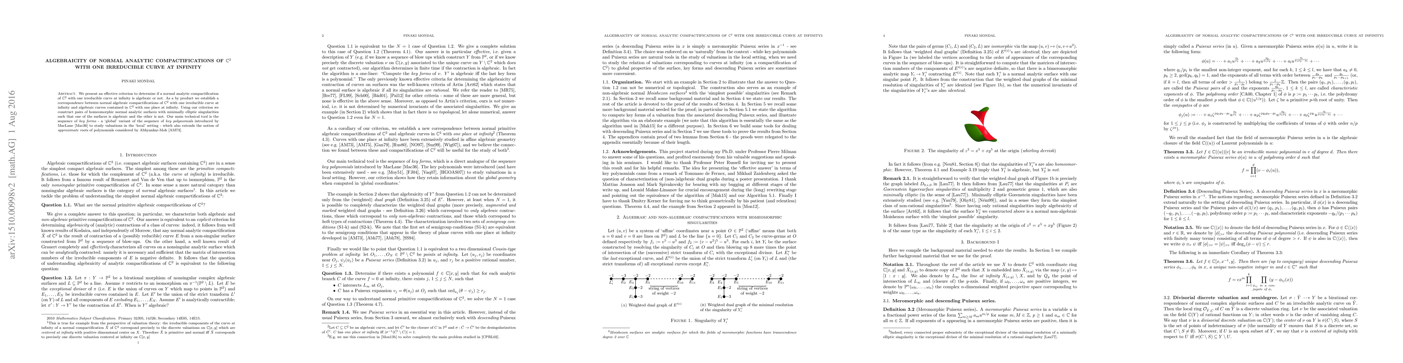 We present an effective criterion to determine if a normal analytic compactification of C^2 with one irreducible curve at infinity is algebraic or not. As a by product we establish a correspondence between normal algebraic compactifications of C^2 with one irreducible curve at infinity and algebraic curves contained in C^2 with one place at infinity. Using our criterion we construct pairs of homeomorphic normal analytic surfaces with minimally elliptic singularities such that one of the surfaces is algebraic and the other is not. Our main technical tool is the sequence of "key forms" - a 'global' variant of the sequence of "key polynomials" introduced by MacLane to study valuations in the 'local' setting - which also extends the notion of "approximate roots" of polynomials considered by Abhyankar and Moh.