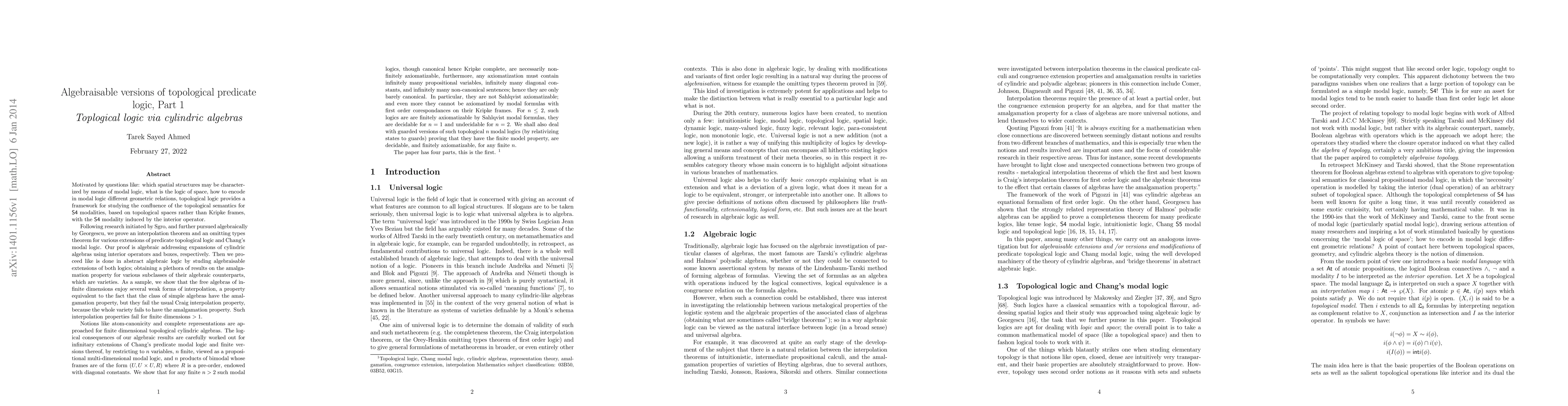 This paper investigates algebraic versions of predicate topological logic, proving interpolation and omitting types theorems for extensions of Chang's modal logic. It uses algebraic methods involving cylindric algebras to explore the amalgamation properties and representations of these logics, with implications for infinitary and finite versions of Chang's modal logic.
