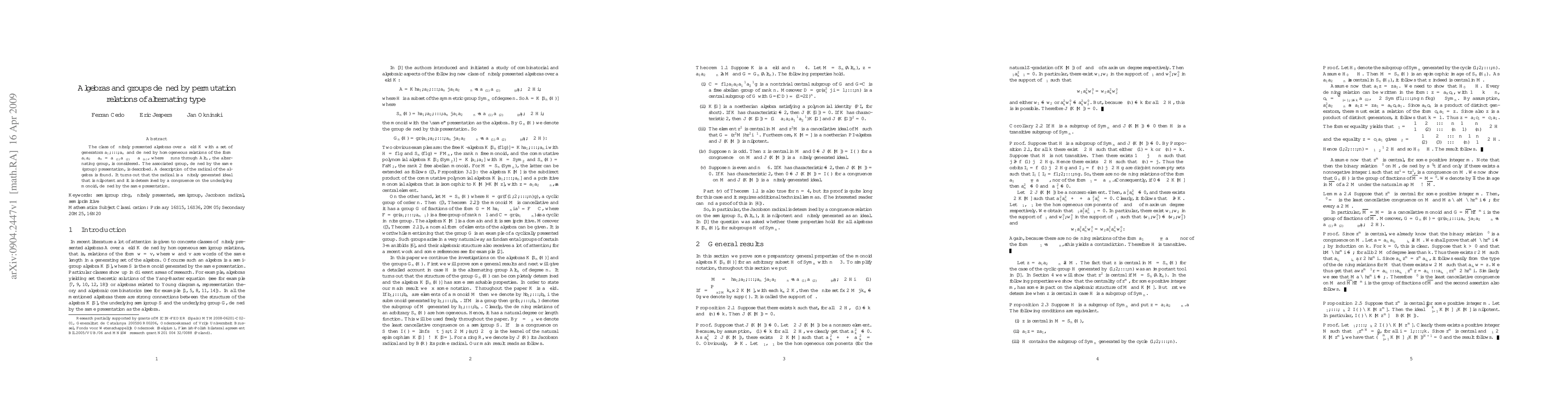 The class of finitely presented algebras over a field $K$ with a set of generators $a_{1},..., a_{n}$ and defined by homogeneous relations of the form $a_{1}a_{2}... a_{n} =a_{\sigma (1)} a_{\sigma (2)} ... a_{\sigma (n)}$, where $\sigma$ runs through $\Alt_{n}$, the alternating group, is considered. The associated group, defined by the same (group) presentation, is described. A description of the radical of the algebra is found. It turns out that the radical is a finitely generated ideal that is nilpotent and it is determined by a congruence on the underlying monoid, defined by the same presentation.
