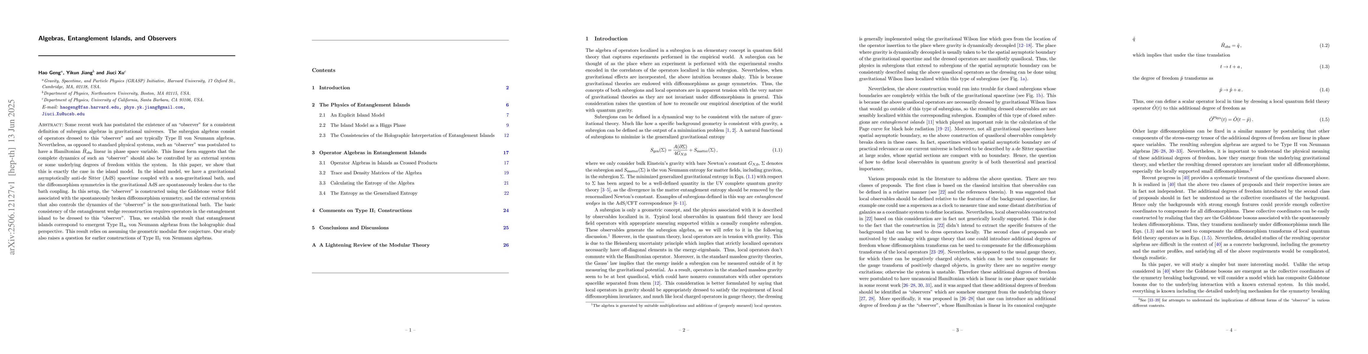 Some recent work has postulated the existence of an "observer" for a consistent definition of subregion algebras in gravitational universes. The subregion algebras consist of operators dressed to this "observer" and are typically Type II von Neumann algebras. Nevertheless, as opposed to standard physical systems, such an "observer" was postulated to have a Hamiltonian $\hat{H}_{\text{obs}}$ linear in phase space variable. This linear form suggests that the complete dynamics of such an "observer" should also be controlled by an external system or some underlying degrees of freedom within the system. In this paper, we show that this is exactly the case in the island model. In the island model, we have a gravitational asymptotically anti-de Sitter (AdS) spacetime coupled with a non-gravitational bath, and the diffeomorphism symmetries in the gravitational AdS are spontaneously broken due to the bath coupling. In this setup, the "observer" is constructed using the Goldstone vector field associated with the spontaneously broken diffeomorphism symmetry, and the external system that also controls the dynamics of the "observer" is the non-gravitational bath. The basic consistency of the entanglement wedge reconstruction requires operators in the entanglement island to be dressed to this "observer". Thus, we establish the result that entanglement islands correspond to emergent Type II$_{\infty}$ von Neumann algebras from the holographic dual perspective. This result relies on assuming the geometric modular flow conjecture. Our study also raises a question for earlier constructions of Type II$_{1}$ von Neumann algebras.