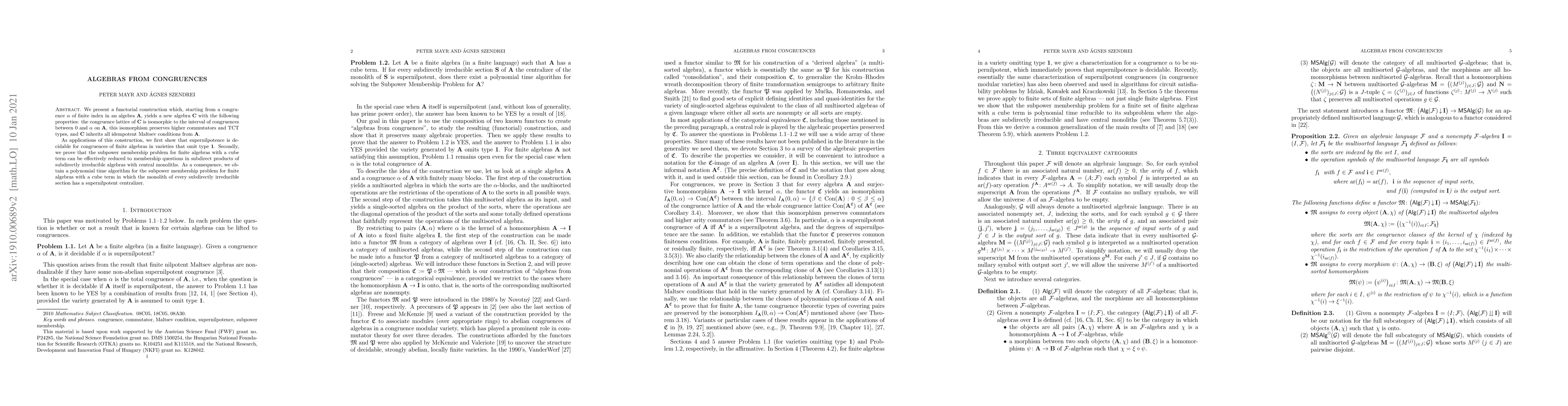 We present a functorial construction which, starting from a congruence $\alpha$ of finite index in an algebra A, yields a new algebra C with the following properties: the congruence lattice of C is isomorphic to the interval of congruences between 0 and $\alpha$ on A, this isomorphism preserves higher commutators and TCT types, and C inherits all idempotent Maltsev conditions from A. As applications of this construction, we first show that supernilpotence is decidable for congruences of finite algebras in varieties that omit type 1. Secondly, we prove that the subpower membership problem for finite algebras with a cube term can be effectively reduced to membership questions in subdirect products of subdirectly irreducible algebras with central monoliths. As a consequence, we obtain a polynomial time algorithm for the subpower membership problem for finite algebras with a cube term in which the monolith of every subdirectly irreducible section has a supernilpotent centralizer.
