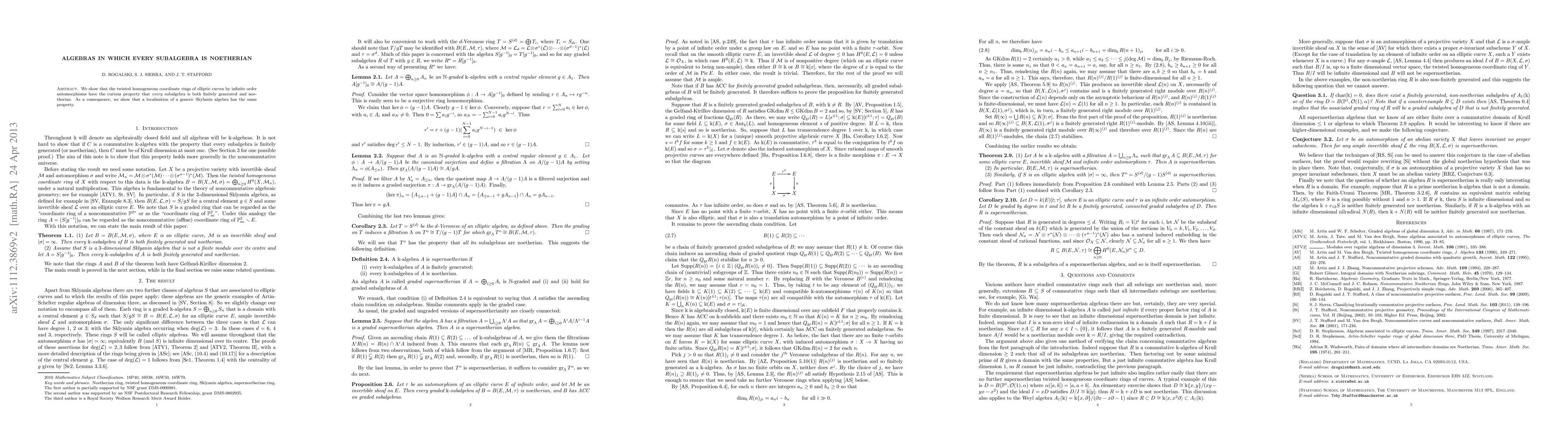 Summary: This paper demonstrates that twisted homogeneous coordinate rings of elliptic curves via infinite order automorphisms exhibit the trait where every subalgebra is finitely generated and noetherian. It further concludes that localizations of generic Skylanin algebras share this characteristic.