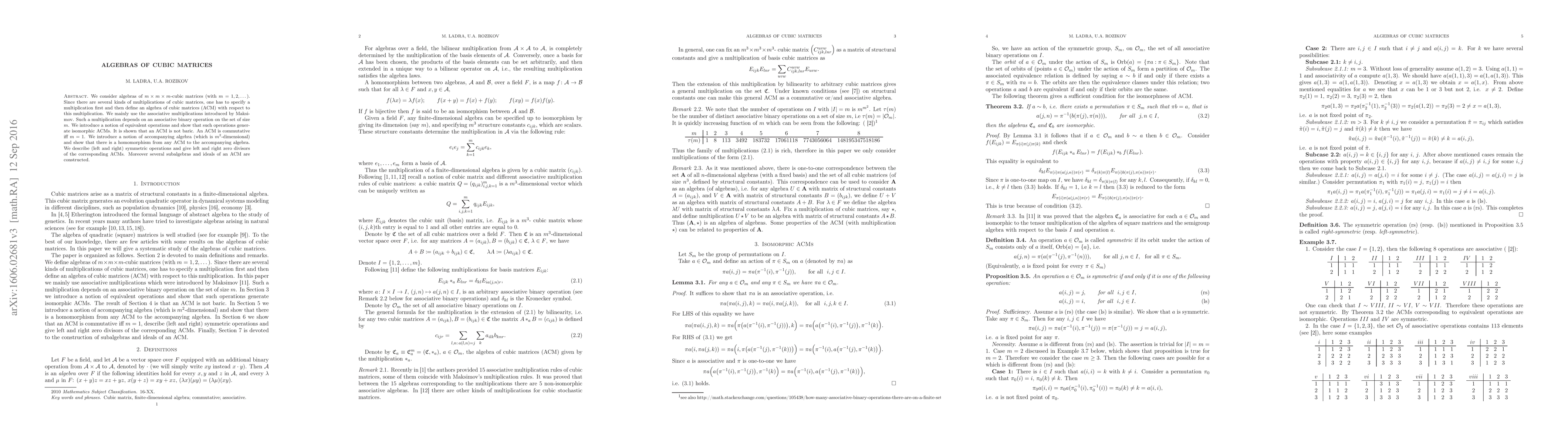 This paper explores algebras of $m\times m\times m$-cubic matrices using associative multiplications introduced by Maksimov, demonstrating that equivalent operations generate isomorphic algebras. It also introduces accompanying algebras and discusses properties like commutativity, homomorphisms, and the existence of zero divisors.