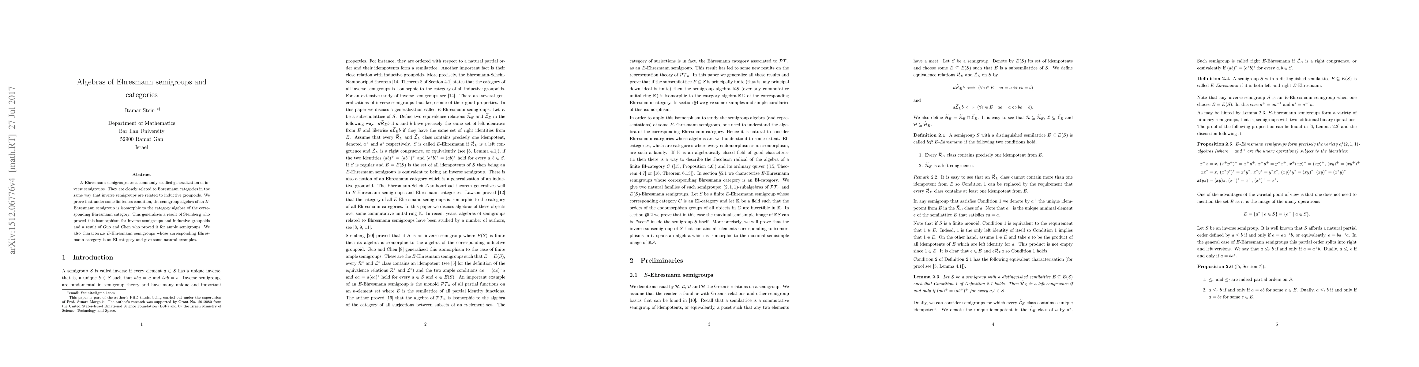 This paper explores the algebra of $E$-Ehresmann semigroups and their relation to Ehresmann categories, proving that under certain finiteness conditions, the semigroup algebra is isomorphic to the category algebra. An erratum corrects a previous oversight in the main theorem by requiring the semigroup to be left restriction for the suggested isomorphism to hold.