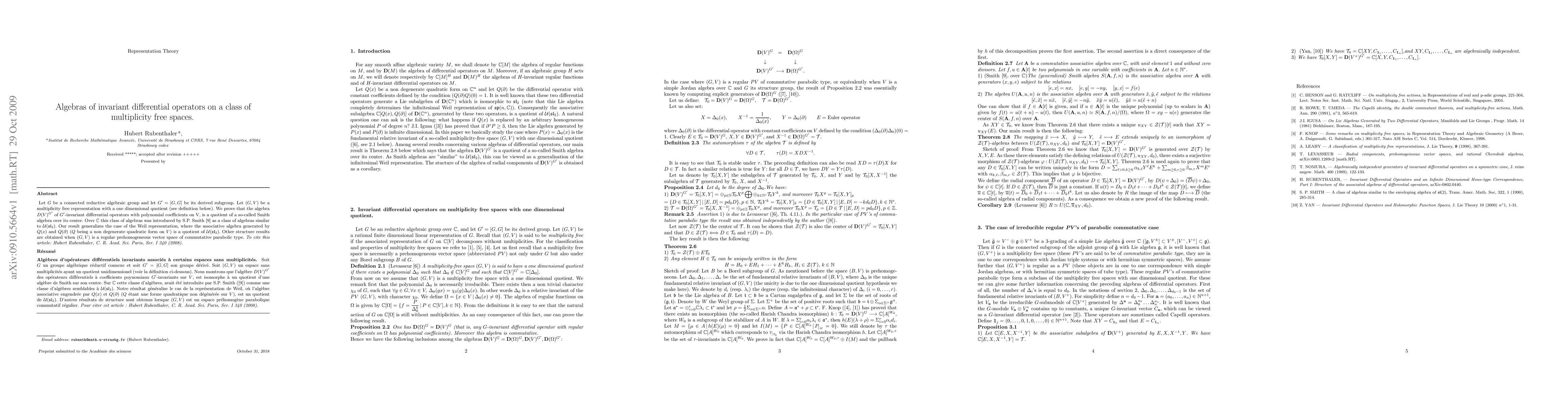Let G be a connected reductive algebraic group and let G'=[G,G] be its derived subgroup. Let (G,V) be a multiplicity free representation with a one dimensional quotient (see definition below). We prove that the algebra D(V)^{G'} of G'-invariant differential operators with polynomial coefficients on V, is a quotient of a so-called Smith algebra over its center. Over C this class of algebras was introduced by S.P. Smith as a class of algebras similar to the enveloping algebra U(sl(2)) of sl(2). Our result generalizes the case of the Weil representation, where the associative algebra generated by Q(x) and Q(?) (Q being a non degenerate quadratic form on V) is a quotient of U(sl(2)) Other structure results are obtained when (G,V) is a regular prehomogeneous vector space of commutative parabolic type.
