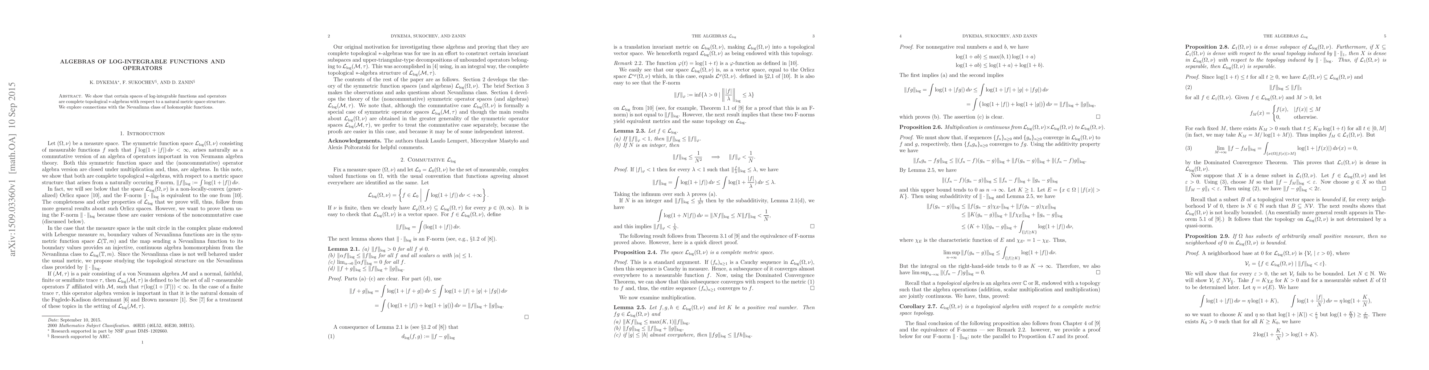 We show that certain spaces of log-integrable functions and operators are complete topological *-algebras with respect to a natural metric space structure. We explore connections with the Nevanlinna class of holomorphic functions.