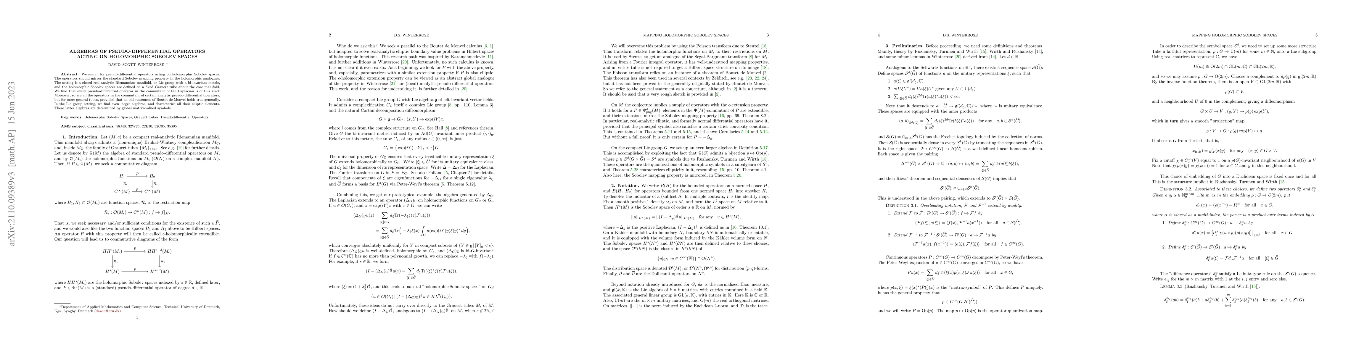 Summary: This paper investigates pseudo-differential operators acting on holomorphic Sobolev spaces on real-analytic manifolds or Lie groups, showing that operators in the commutant of the Laplacian and certain analytic pseudo-differential operators fit this description. In Lie group settings, it identifies and characterizes larger algebras of such operators determined by global matrix-valued symbols.