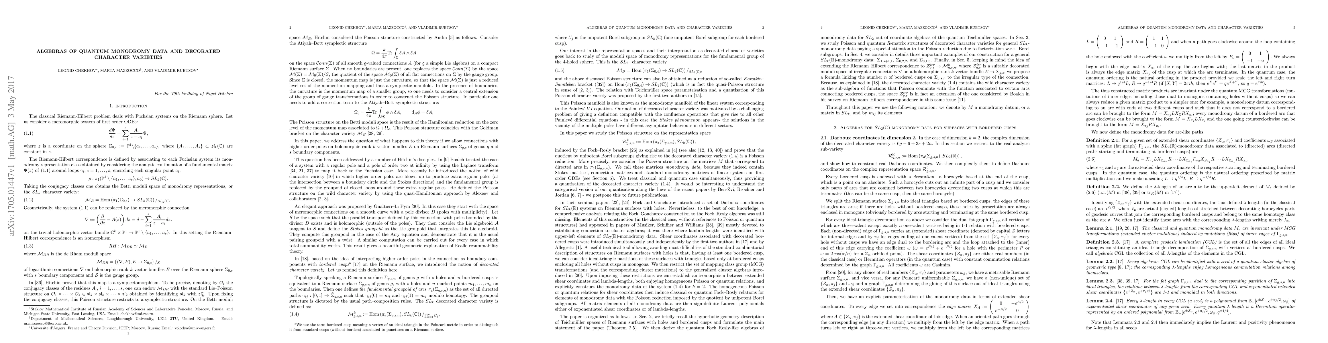 The Riemann-Hilbert correspondence is an isomorphism between the de Rham moduli space and the Betti moduli space, defined by associating to each Fuchsian system its monodromy representation class. In 1997 Hitchin proved that this map is a symplectomorphism. In this paper, we address the question of what happens to this theory if we extend the de Rham moduli space by allowing connections with higher order poles. In our previous paper arXiv:1511.03851, based on the idea of interpreting higher order poles in the connection as boundary components with bordered cusps (vertices of ideal triangles in the Poincar\'e metric) on the Riemann surface, we introduced the notion of decorated character variety to generalize the Betti moduli space. This decorated character variety is the quotient of the space of representations of the fundamental groupid of arcs by a product of unipotent Borel sub-groups (one per bordered cusp). Here we prove that this representation space is endowed with a Poisson structure induced by the Fock--Rosly bracket and show that the quotient by unipotent Borel subgroups giving rise to the decorated character variety is a Poisson reduction. We deal with the Poisson bracket and its quantization simultaneously, thus providing a quantisation of the decorated character variety. In the case of dimension 2, we also endow the representation space with explicit Darboux coordinates. We conclude with a conjecture on the extended Riemann-Hilbert correspondence in the case of higher order poles.