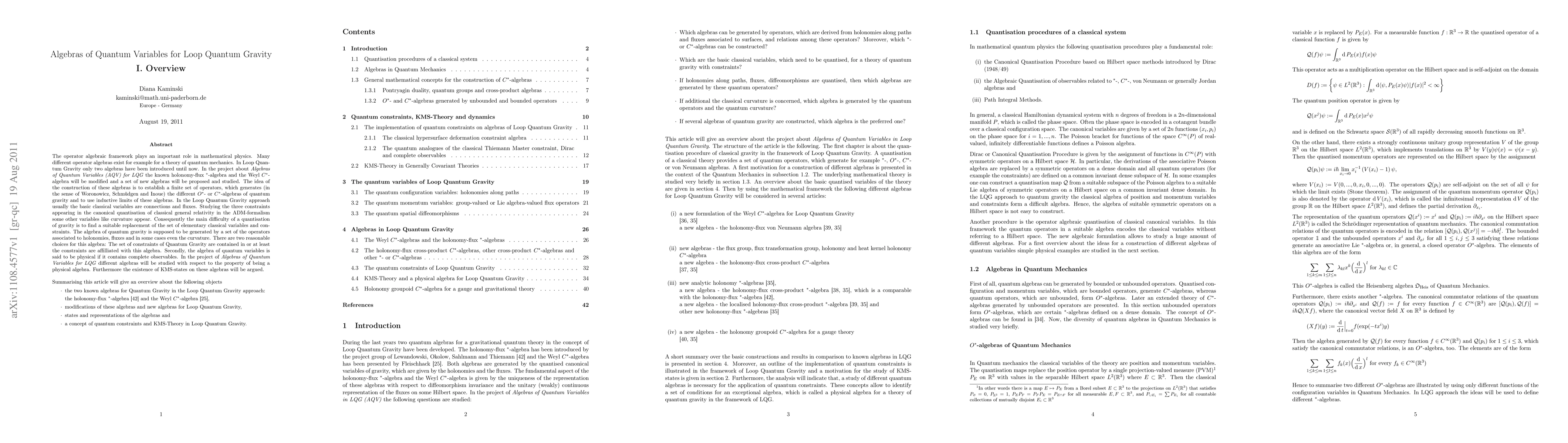 The operator algebraic framework plays an important role in mathematical physics. Many different operator algebras exist for example for a theory of quantum mechanics. In Loop Quantum Gravity only two algebras have been introduced until now. In the project about 'Algebras of Quantum Variables (AQV) for LQG' the known holonomy-flux *-algebra and the Weyl C*-algebra will be modified and a set of new algebras will be proposed and studied. The idea of the construction of these algebras is to establish a finite set of operators, which generates (in the sense of Woronowicz, Schm\"udgen and Inoue) the different O*- or C*-algebras of quantum gravity and to use inductive limits of these algebras. In the Loop Quantum Gravity approach usually the basic classical variables are connections and fluxes. Studying the three constraints appearing in the canonical quantisation of classical general relativity in the ADM-formalism some other variables like curvature appear. Consequently the main difficulty of a quantisation of gravity is to find a suitable replacement of the set of elementary classical variables and constraints. The algebra of quantum gravity is supposed to be generated by a set of the operators associated to holonomies, fluxes and in some cases even the curvature. There are two reasonable choices for this algebra: The set of constraints of Quantum Gravity are contained in or at least the constraints are affilliated with this algebra. Secondly, the algebra of quantum variables is said to be physical if it contains complete observables. In the project of 'Algebras of Quantum Variables for LQG' different algebras will be studied with respect to the property of being a physical algebra. Furthermore the existence of KMS-states on these algebras will be argued.