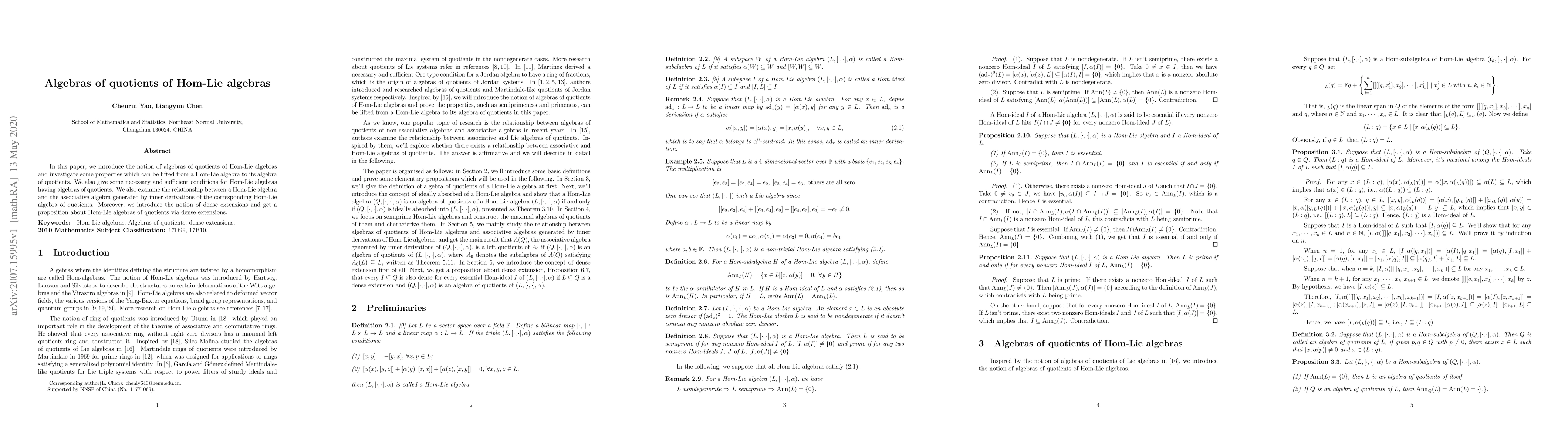 This paper introduces algebras of quotients for Hom-Lie algebras, explores their properties, and establishes conditions for their existence. It also investigates the connection between Hom-Lie algebras and the associative algebra formed by inner derivations of the corresponding Hom-Lie algebra of quotients, along with a proposition regarding Hom-Lie algebras via dense extensions.