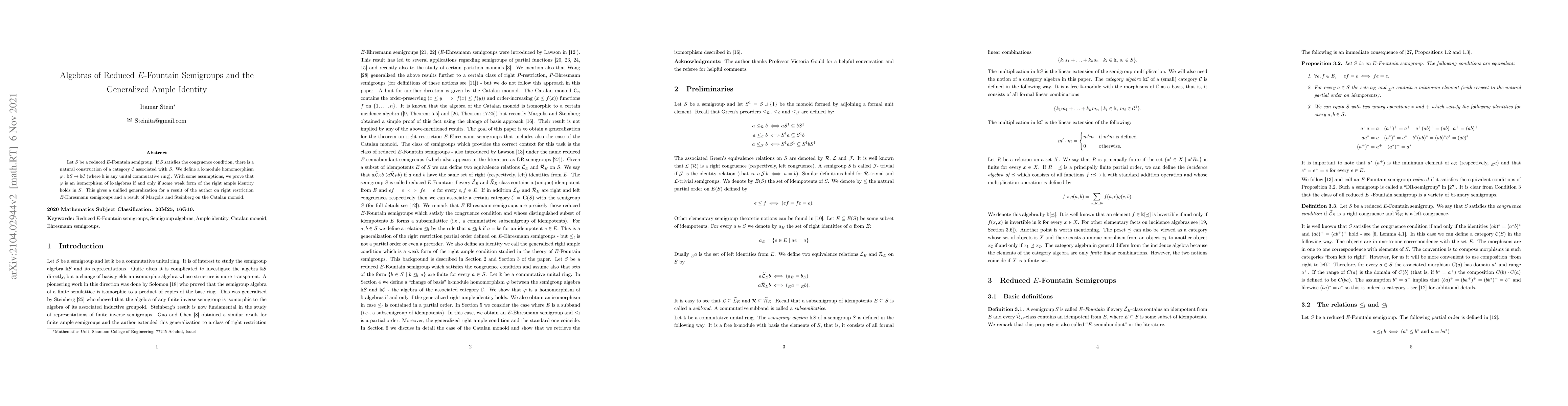A research paper connects reduced $E$-Fountain semigroups with a category $ ext{ extcal{C}}$, proposing that a specific homomorphism is an isomorphism if a certain identity holds in the semigroup, providing a unified generalization of previous results.
