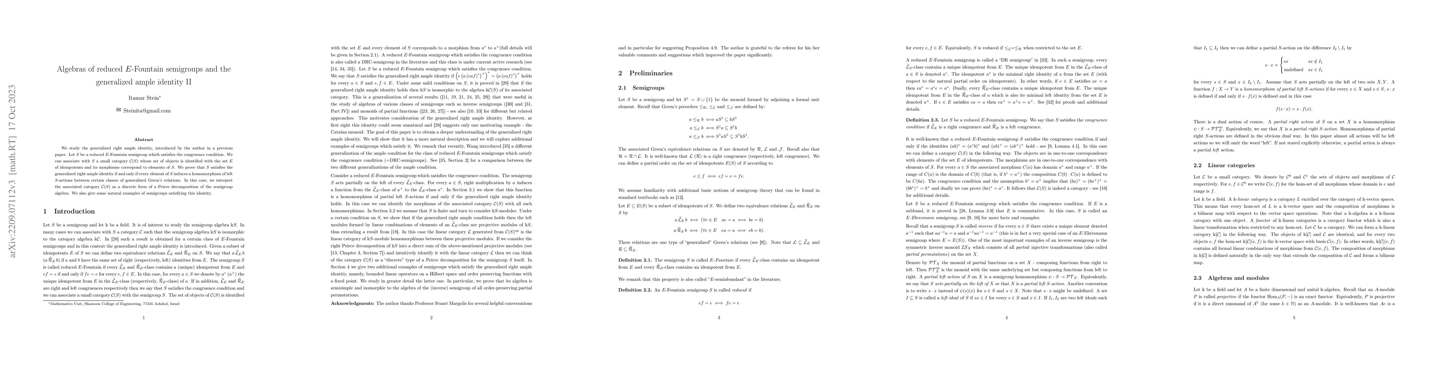 We study the generalized right ample identity, introduced by the author in a previous paper. Let $S$ be a reduced $E$-Fountain semigroup which satisfies the congruence condition. We can associate with $S$ a small category $\mathcal{C}(S)$ whose set of objects is identified with the set $E$ of idempotents and its morphisms correspond to elements of $S$. We prove that $S$ satisfies the generalized right ample identity if and only if every element of $S$ induces a homomorphism of left $S$-actions between certain classes of generalized Green's relations. In this case, we interpret the associated category $\mathcal{C}(S)$ as a discrete form of a Peirce decomposition of the semigroup algebra. We also give some natural examples of semigroups satisfying this identity.