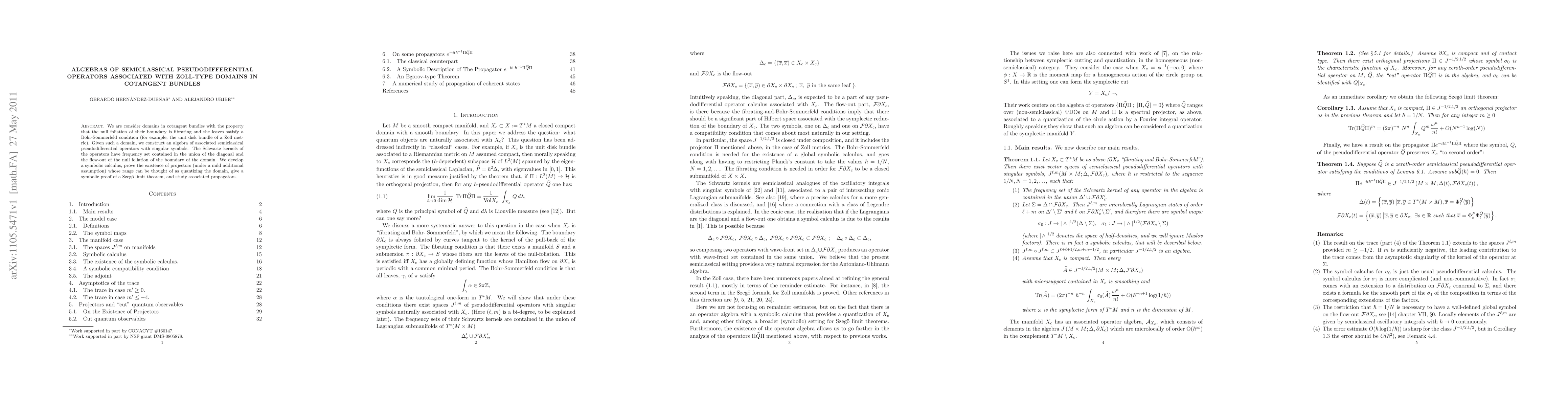 We are consider domains in cotangent bundles with the property that the null foliation of their boundary is fibrating and the leaves satisfy a Bohr-Sommerfeld condition (for example, the unit disk bundle of a Zoll metric). Given such a domain, we construct an algebra of associated semiclassical pseudodifferential operators with singular symbols. The Schwartz kernels of the operators have frequency set contained in the union of the diagonal and the flow-out of the null foliation of the boundary of the domain. We develop a symbolic calculus, prove the existence of projectors (under a mild additional assumption) whose range can be thought of as quantizing the domain, give a symbolic proof of a Szeg\"o limit theorem, and study associated propagators.