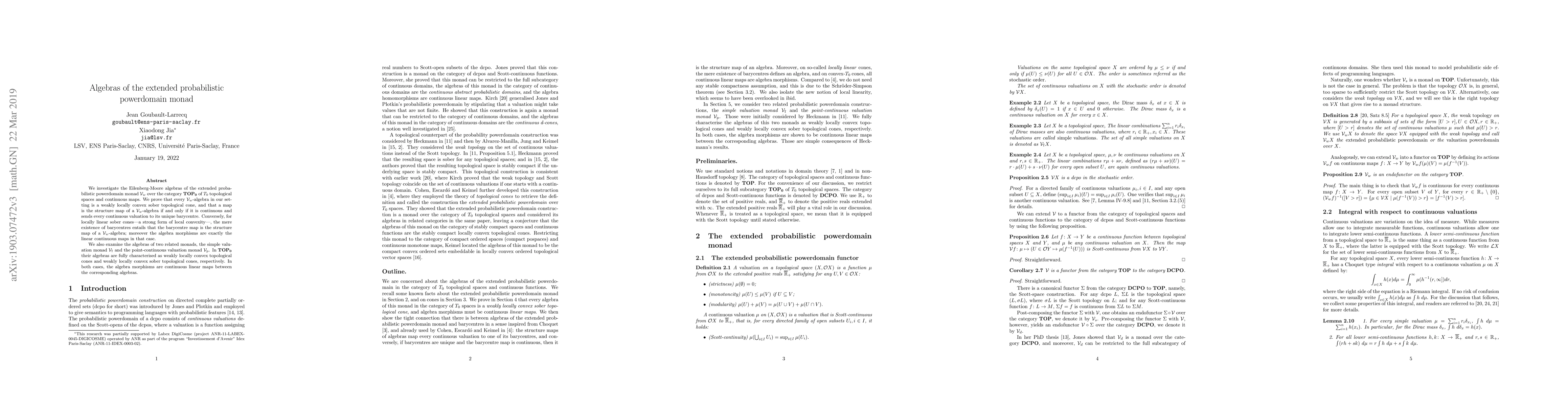 Researchers investigated the algebra structures of extended probabilistic powerdomain monads over topological spaces, finding that certain properties imply local convexity and sobriety.