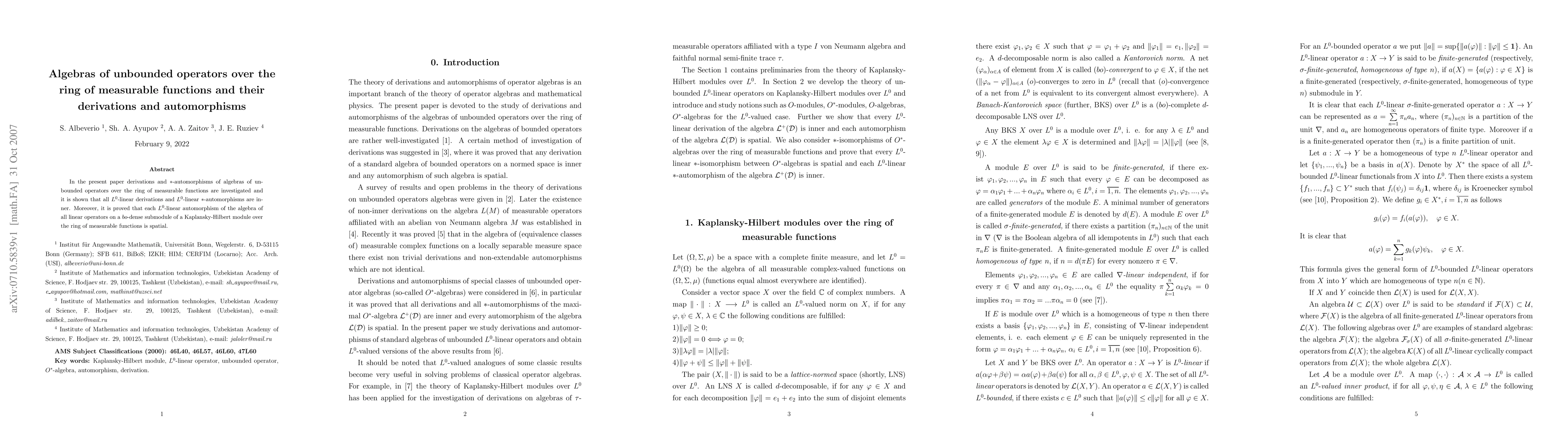 This paper investigates derivations and *-automorphisms of algebras of unbounded operators over the ring of measurable functions, proving that all L^0-linear derivations and L^{0}-linear *-automorphisms are inner, and that each L^0-linear automorphism is spatial.