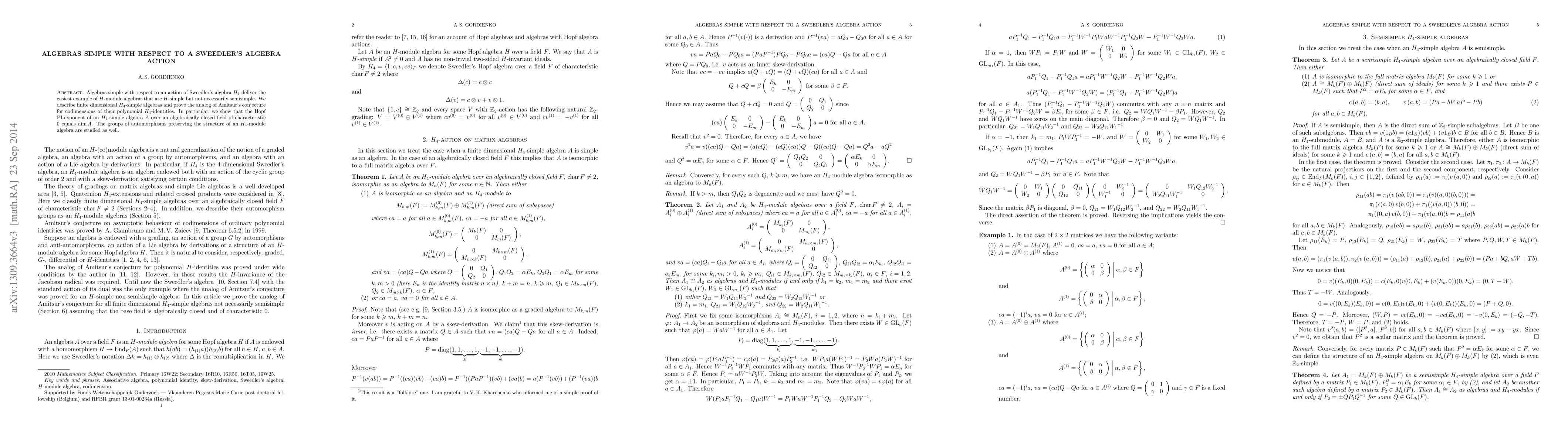Algebras simple with respect to an action of Sweedler's algebra $H_4$ deliver the easiest example of $H$-module algebras that are $H$-simple but not necessarily semisimple. We describe finite dimensional $H_4$-simple algebras and prove the analog of Amitsur's conjecture for codimensions of their polynomial $H_4$-identities. In particular, we show that the Hopf PI-exponent of an $H_4$-simple algebra $A$ over an algebraically closed field of characteristic $0$ equals $\dim A$. The groups of automorphisms preserving the structure of an $H_4$-module algebra are studied as well.