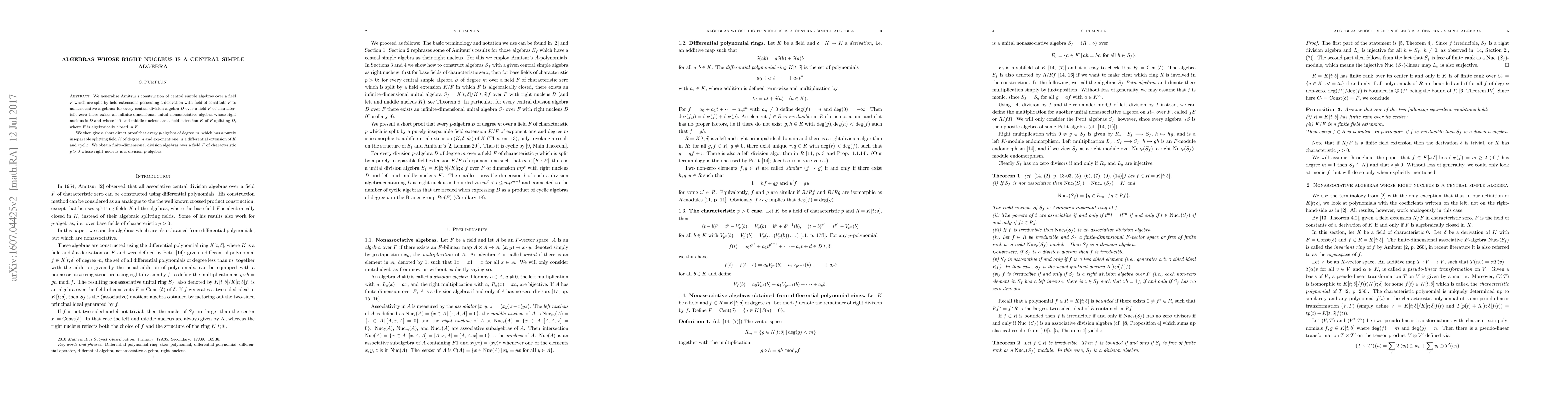 We generalize Amitsur's construction of central simple algebras over a field $F$ which are split by field extensions possessing a derivation with field of constants $F$ to nonassociative algebras: for every central division algebra $D$ over a field $F$ of characteristic zero there exists an infinite-dimensional unital nonassociative algebra whose right nucleus is $D$ and whose left and middle nucleus are a field extension $K$ of $F$ splitting $D$, where $F$ is algebraically closed in $K$. We then give a short direct proof that every $p$-algebra of degree $m$, which has a purely inseparable splitting field $K$ of degree $m$ and exponent one, is a differential extension of $K$ and cyclic. We obtain finite-dimensional division algebras over a field $F$ of characteristic $p>0$ whose right nucleus is a division $p$-algebra.