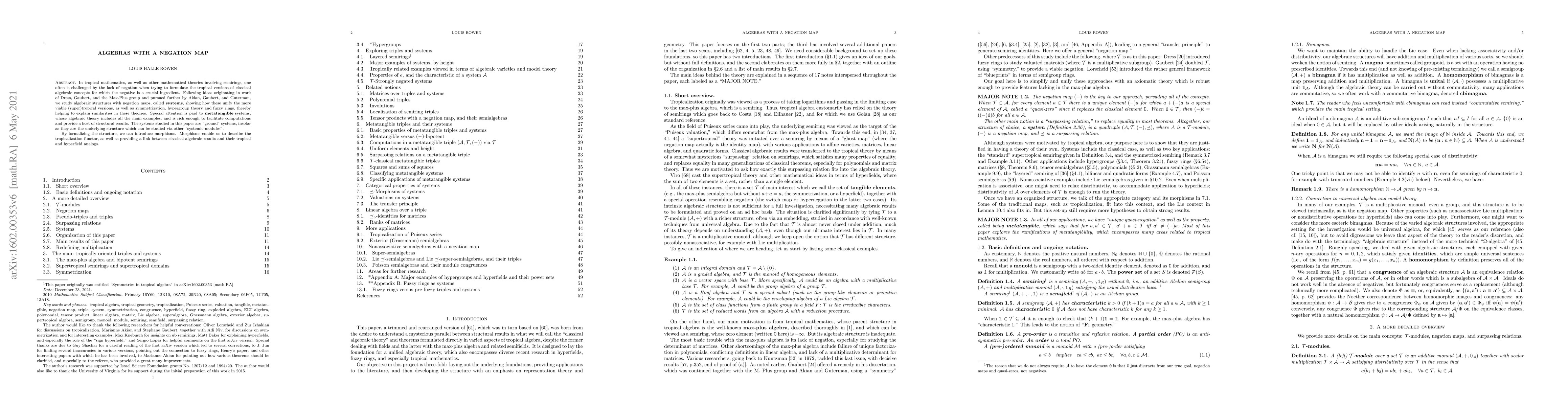 This paper explores algebraic structures called "systems" with a negation map to unify tropical versions of classical algebraic concepts lacking negation, such as determinants and Lie algebras. It introduces meta-tangible T-systems, which encompass many tropical examples and provide structural insights, and uses the tropicalization functor to link classical algebraic results with their tropical analogs.