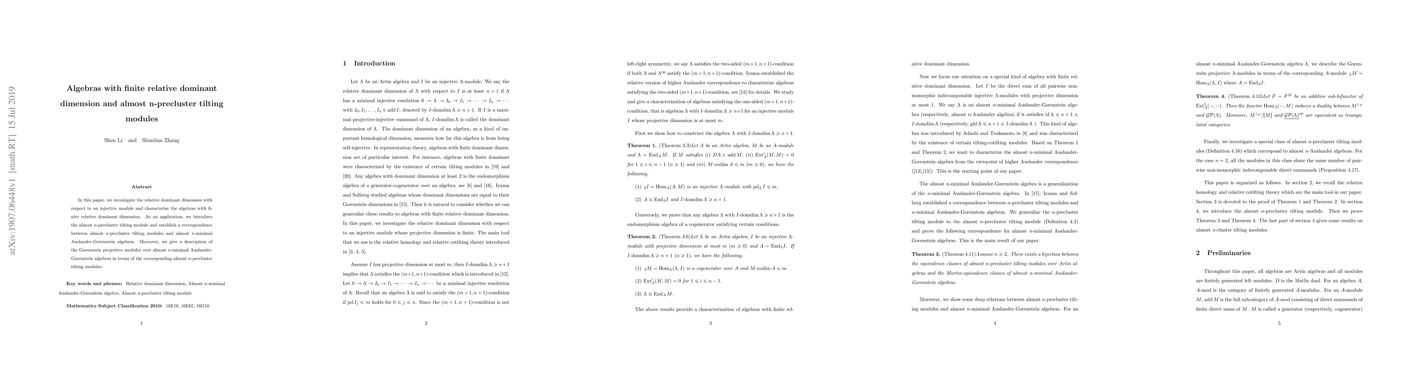 This paper characterizes algebras with finite relative dominant dimension and introduces almost n-precluster tilting modules, establishing a connection between these modules and almost n-minimal Auslander-Gorenstein algebras, as well as describing Gorenstein projective modules in terms of these tilting modules.