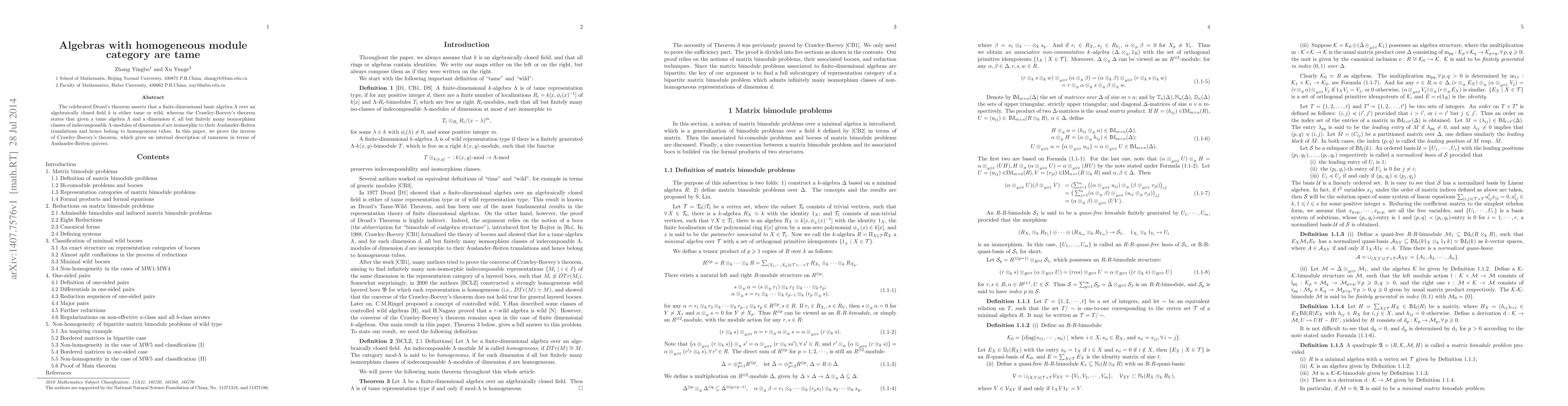 The celebrated Drozd's theorem asserts that a finite-dimensional basic algebra $\Lambda$ over an algebraically closed field $k$ is either tame or wild, whereas the Crawley-Boevey's theorem states that given a tame algebra $\Lambda$ and a dimension $d$, all but finitely many isomorphism classes of indecomposable $\Lambda$-modules of dimension $d$ are isomorphic to their Auslander-Reiten translations and hence belong to homogeneous tubes. In this paper, we prove the inverse of Crawley-Boevey's theorem, which gives an internal description of tameness in terms of Auslander-Reiten quivers.